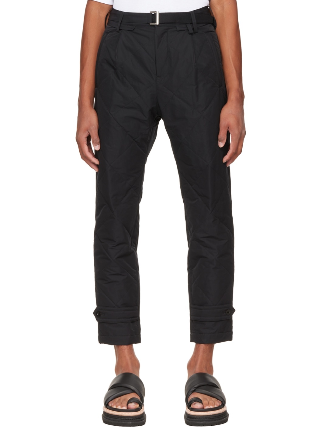 Quilted insulated polyester satin trousers. · Detachable and adjustable cinch belt at waistband · Four-pocket styling · Zip-fly · Adjustable buttoned tab at cuffs Supplier color: Black Body: 100% polyester. Lining: 100% polyester. Trim: 100% cotton. Fill: 100% polyester.