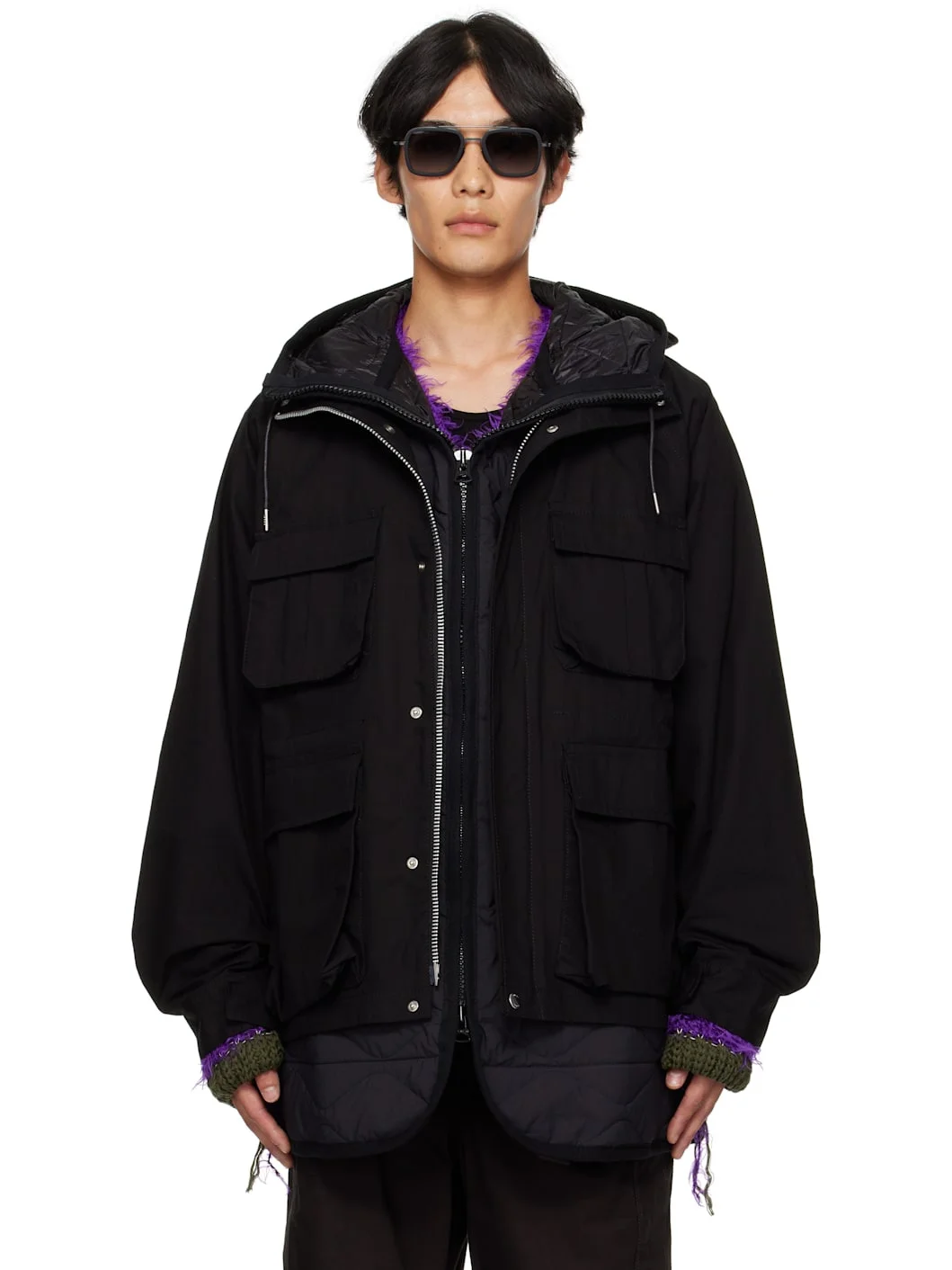 Cotton- and nylon-blend ripstop jacket. · Cord-lock drawstring at hood · Funnel neck · Two-way zip closure with press-stud placket · Flap and patch pockets at front · Raglan sleeves · Adjustable press-stud tab at cuffs · Zip vent at back · Cord-lock drawstring at interior waist · Integrated insulated and quilted liner · Full satin lining Supplier color: Black Body: 53% cotton, 47% nylon. Trim 1: 100% wool. Trim 2: 100% polyester. Lining 1: 100% nylon. Lining 2: 100% cupro. Made in Japan 252445M180014