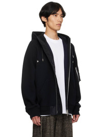 Padded cotton-blend hoodie. · Nylon satin trim throughout · Drawstring at hood · Two-way zip closure · Webbing trim and logo-engraved rivets at chest · Patch pockets at waist · Rib-knit hem and cuffs · Saddle shoulders · Utility pocket and pen slots at sleeve Supplier color: Black Body: 62% cotton, 38% polyester. Trim 1: 100% nylon. Trim 2: 55% polyester, 45% cotton. Fill: 100% polyester. Made in Japan 252445M202021