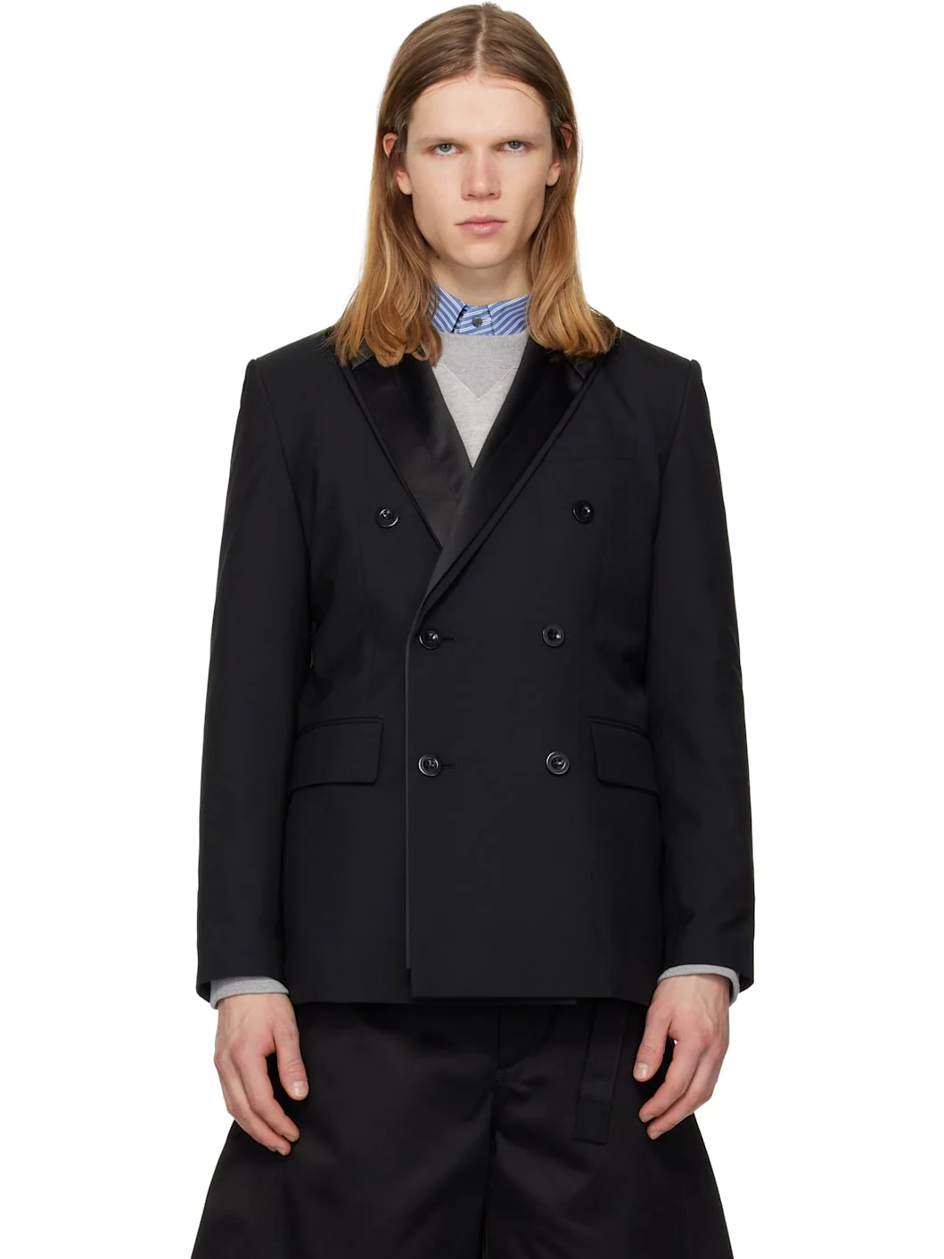 Plain-woven wool-blend blazer. · Layered notched lapels · Double-breasted button closure · Welt pocket at chest · Flap pockets at front · Padded shoulders · Surgeon's cuffs · Central vent at back hem · Full satin lining Supplier color: Black Body: 70% polyester, 30% wool. Trim: 100% polyester. Lining: 100% cupro. Made in Japan 261445M195005