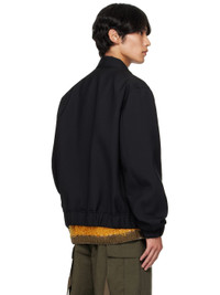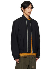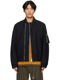Insulated plain-woven wool-blend bomber jacket. · Stand collar · Offset two-way zip closure · Press-stud tabs at chest · Welt pockets at front · Elasticized hem and cuffs · Utility pocket at sleeve · Full cupro satin lining Supplier color: Black Body: 70% polyester, 30% wool. Trim: 100% polyester. Fill: 100% polyester. Lining: 100% cupro. Made in Japan 252445M175018