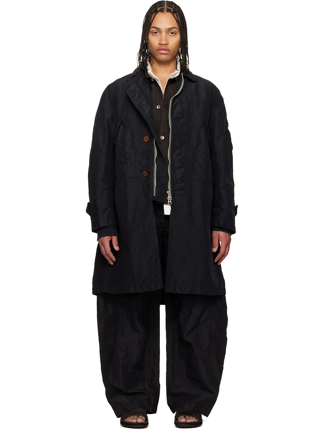 Crinkled nylon twill coat. · Button throat guard at spread collar · Two-way zip closure with button placket · Webbing trim at chest · Flap pockets · Button tab at cuffs · Inset rib-knit cuffs · Central vent at back hem Supplier color: Black Body: 100% nylon. Trim: 55% polyester, 44% cotton, 1% polyurethane. Fill: 100% polyester. Lining: 100% polyester. Made in Japan 261445M176002