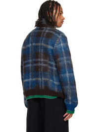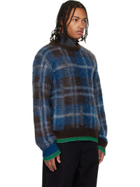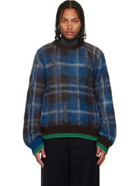 Brushed knit mohair-blend sweater. · Distressing and check pattern throughout · Rib-knit crewneck, hem, and cuffs · Dropped shoulders · Blanket stitching at hem and cuffs Supplier color: Brown/Blue Body: 51% mohair, 32% nylon, 17% wool. Trim: 80% cotton, 20% polyester. Made in Japan 252445M201008