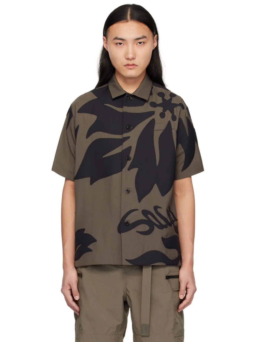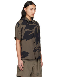 Plain-woven polyester- and wool-blend shirt. Floral appliques throughout. · Spread collar · Button closure · Mock patch pocket at chest · Logo applique at front · Droptail hem · Vented side seams Supplier color: Taupe/Navy Body: 70% polyester, 30% wool. Trim: 90% wool, 10% nylon. Trim 2: 70% polyester, 30% wool. Trim 3: 80% polyester, 15% rayon, 5% polyurethane. Made in Japan 241445M192022