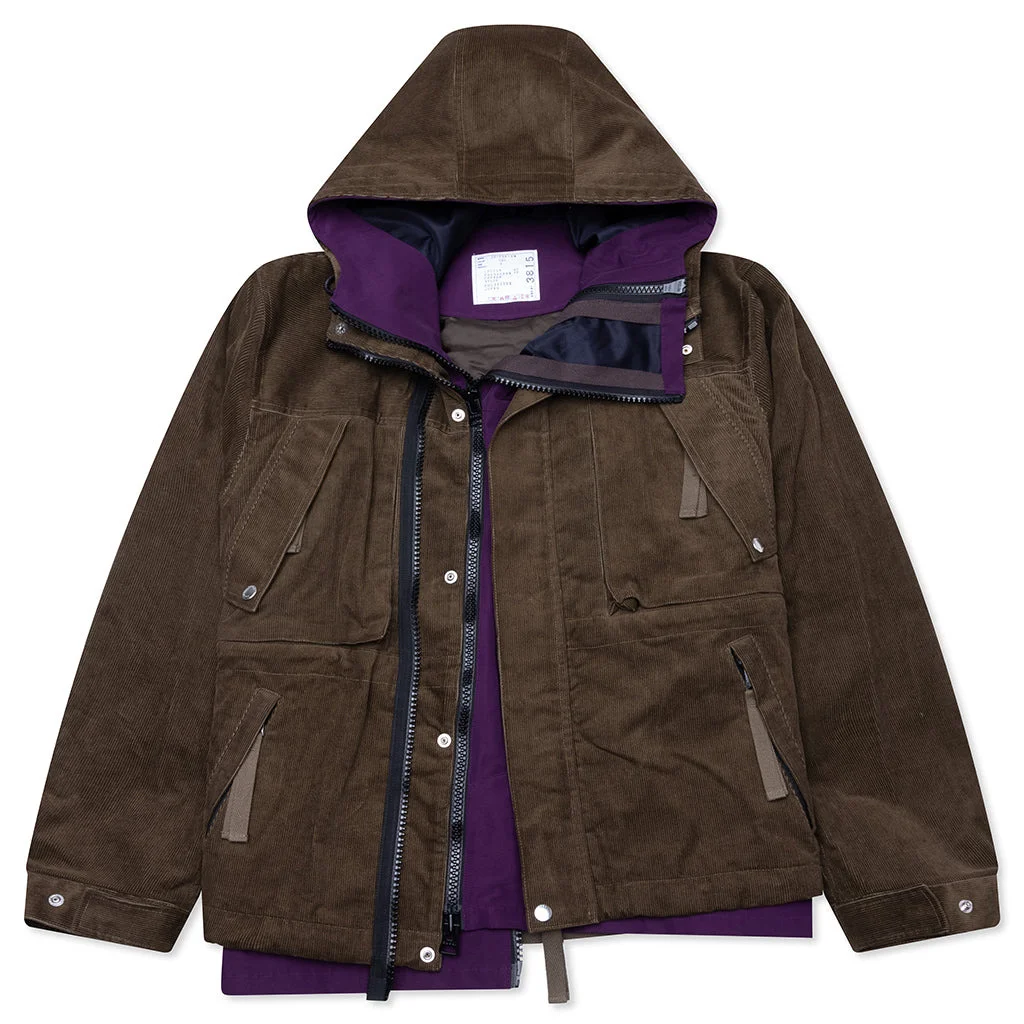 Introducing the Corduroy Blouson from Sacai. Cut from cotton and polyester, this blouson features a corduroy design on the outer layer to create subtle tonal variations for an outerwear aesthetic. A full zipper closure on both interior and exterior layers, snap buttons add extra secureness, and an adjustable bungee cord waist. A high collar and cuffs round out the look. - Main: 80% Cotton, 20% Polyester - Lining: 100% Cupro - Layered jacket design - Two front zipper closures - Snap button closures - Adjustable hood - High collar - Multiple pockets - Elastic & buttoned cuffs - Adjustable bungee cord waist - Style No: 25-03815M-501