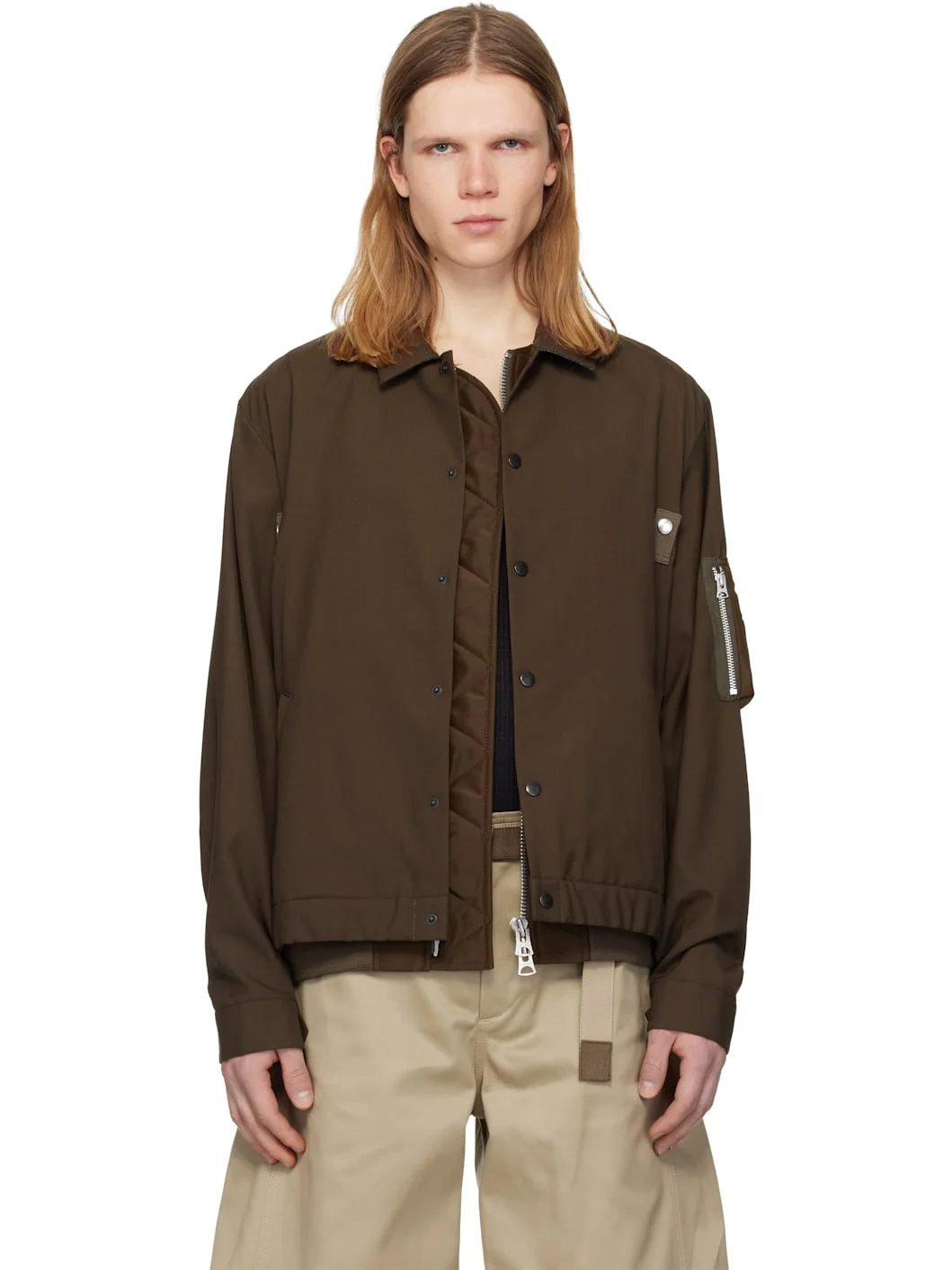 Plain-woven wool-blend bomber jacket. · Integrated nylon twill underlay · Spread collar · Zip closure with press-stud placket · Press-stud tabs at chest · Welt pockets at waist · Inset rib-knit hem · Utility pocket at sleeve · Adjustable press-stud barrel cuffs · Fully lined Supplier color: Brown Body: 70% polyester, 30% wool. Trim 1: 100% nylon. Trim 2: 55% polyester, 44% cotton, 1% polyurethane. Fill: 100% polyester. Lining: 100% cupro. Made in Japan 261445M175013