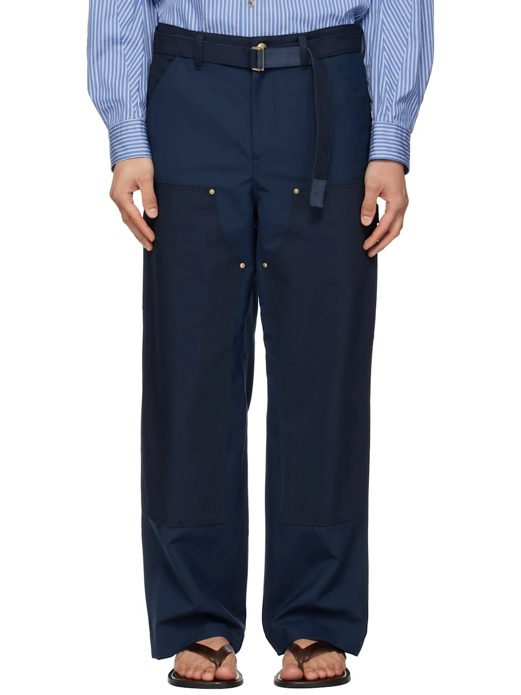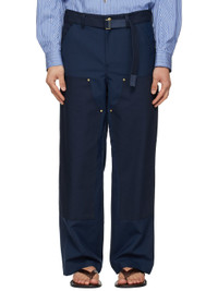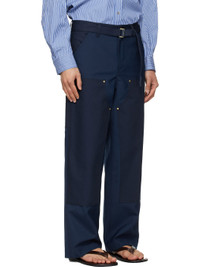 Plain-woven wool-blend trousers. · Cotton canvas trim throughout · Belt loops and detachable cinch belt at waistband · Four-pocket styling · Zip fly · Patch pockets at outseam · Hammer loop and patch pocket at outseam · Logo patch at back pocket · Full satin lining Part of the sacai x Carhartt Work In Progress collaboration. Supplier color: Blue Body: 70% polyester, 30% wool. Trim: 100% cotton. Lining: 100% cupro. Made in Japan 261445M191028