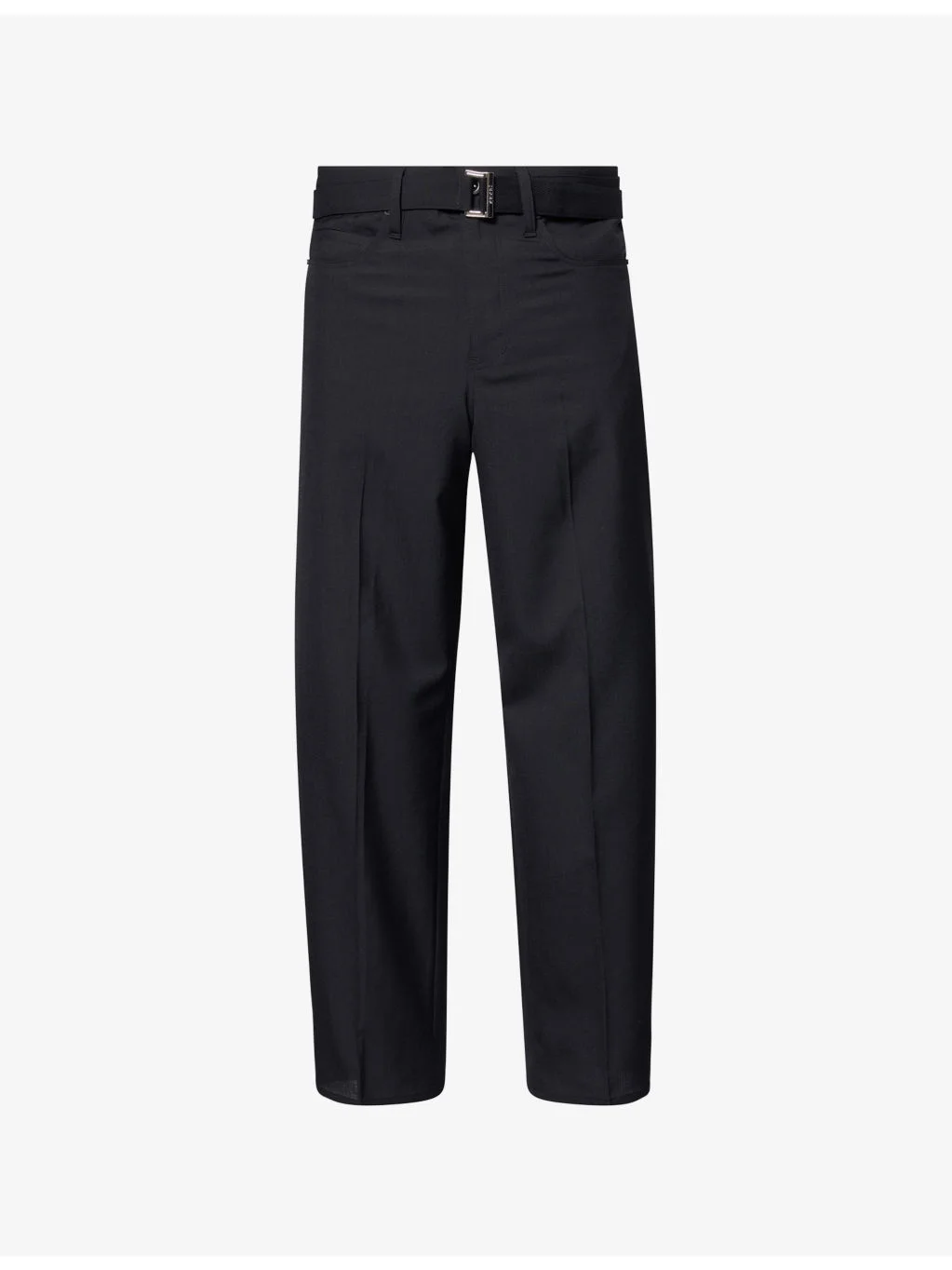 PRODUCT DETAILS - Sacai wool-blend trousers - 70% polyester, 30% wool - Button and zip-fly fastening - Classic fit, high-rise, straight leg, adjustable/removable belt, belt loops, classic five pockets, pressed creases at front and back - Dry clean - Made in Japan - Size 1: rise 12.2in / 31cm, inside leg 29.1in / 74cm, leg opening 18.8in / 48cm - Model is 6ft 2in/1.88m and wears a size 1 - Lightweight, non-stretch Ref: R04489278