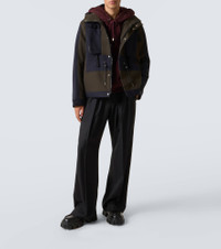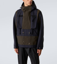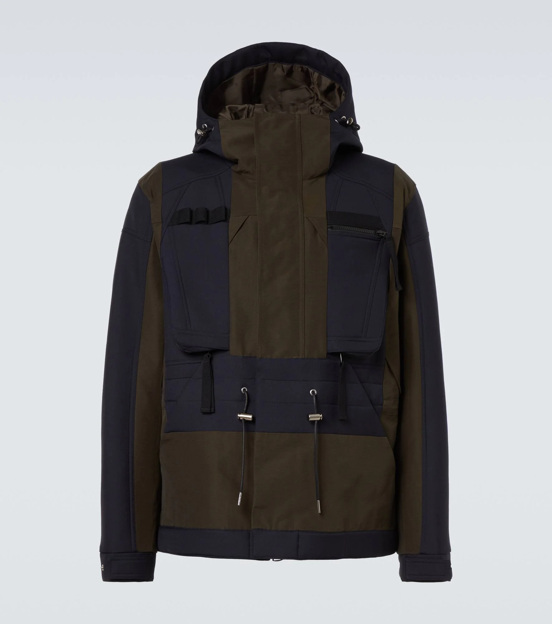 Sacai’s penchant for hybrid designs sees contrasting textures, fabrics, and techniques combined to create entirely unique and innovative styles. This colorblocked jacket is made from durable technical fabric with grosgrain trims, a protective hood, and adjustable drawstring waist. Product Details - Material: 70% polyester, 30% wool - Care instructions: dry clean - Made in Japan - Designer color name: NavyxD/Khaki - Item color: blue, green - Material II: 100% polyester - Trim: 60% cotton, 40% nylon - Lining: 100% cupro - Closure: two-way zipped front with snap-button fastenings - Pockets: zipped pockets - Drawstring waist - Drawstring hood - Item number: P01068427 Size & Fit - True to size - Loose fit, drawstring waist - Adjustable hem - Non-stretchy fabric - Falls to the hip - Height of model is 188cm-74" and wears a size 4