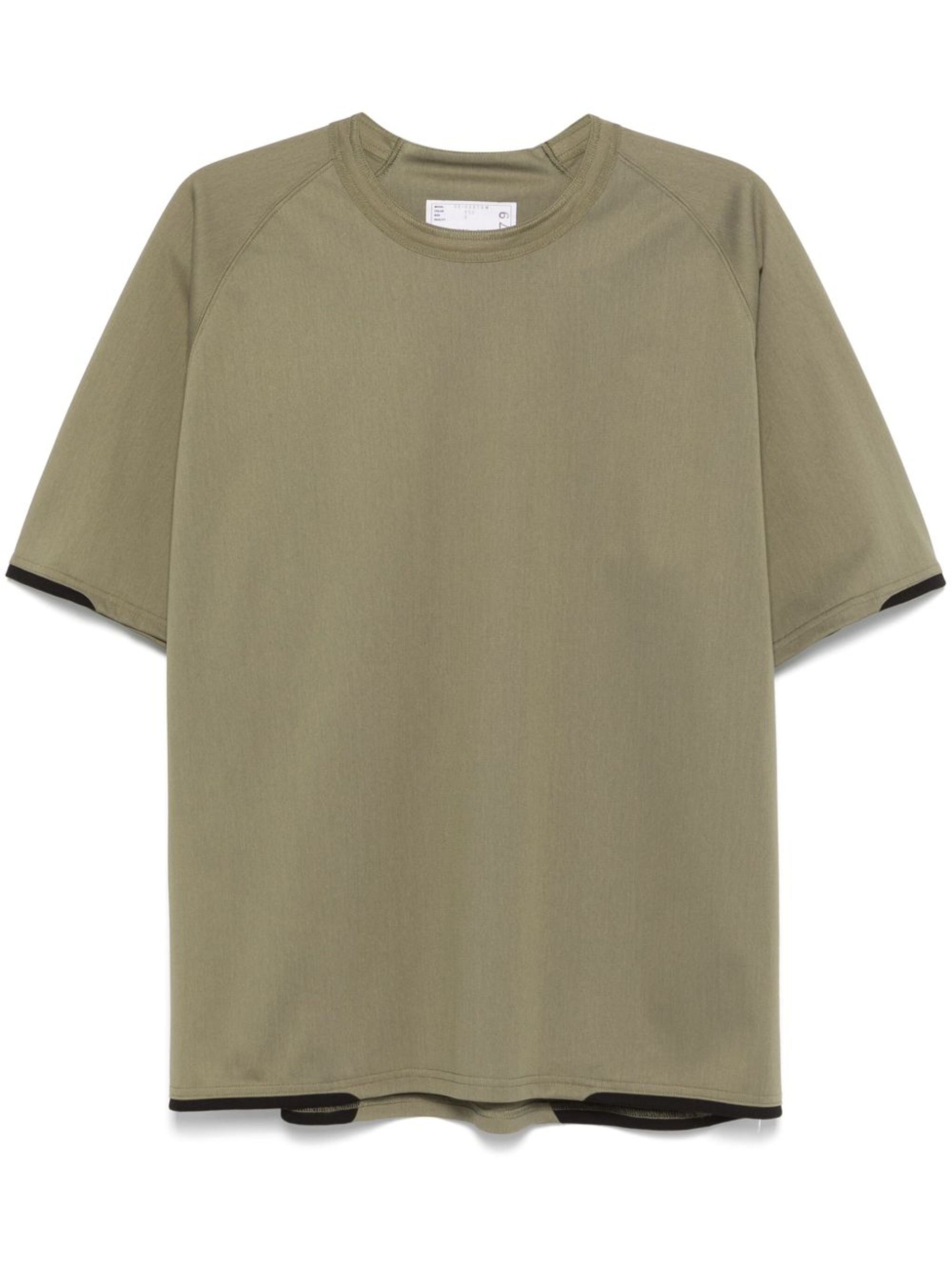 olive green contrasting panel detail crew neck short raglan sleeves Size & Fit Model Measurements: Height: 1.86 m Bust/Chest: 97.0 cm Hips: 97.0 cm Waist: 74.0 cm Model wears size 3 Fabric and Care Designer Style ID: 2503679M Designer Colour: 550 GREEN Composition: Cotton 100% Washing instructions: Machine Wash Made in Japan