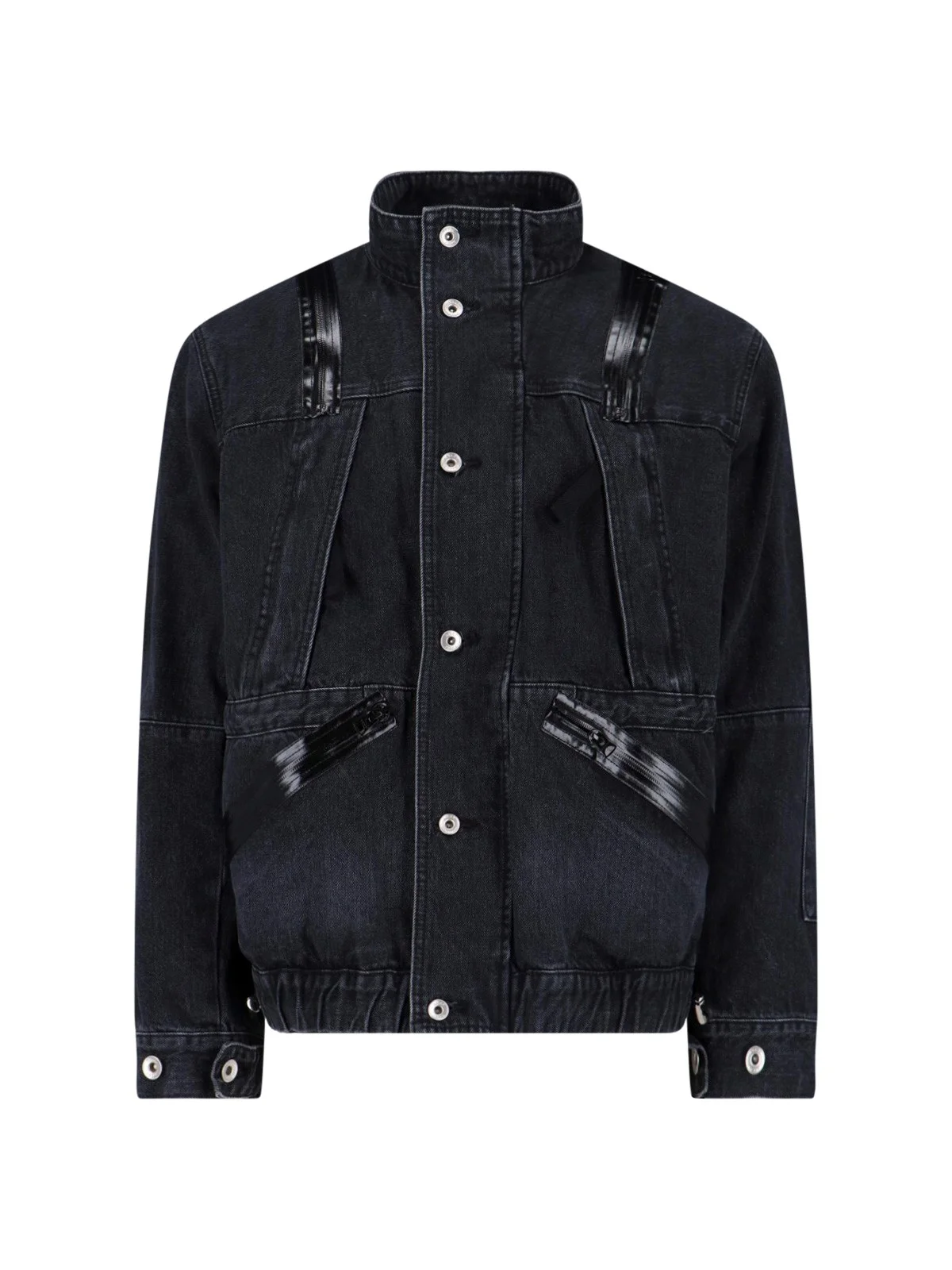 SACAI BLACK DENIM JACKET WITH DISTRESSED WASH, HIGH NECK, ZIP AND BUTTON CLOSURE, LONG SLEEVES, FOUR FRONT ZIP POCKETS, ZIP POCKETS ON THE SLEEVE, BUTTON CUFFS, STRAIGHT HEM. PRODUCT INFO PRODUCT CODE 26 03927M001 COMPOSITION: 100% COTTON SIZE AND FIT: REGULAR FIT MADE IN: JAPAN