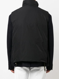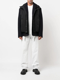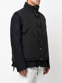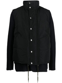 double-layer gilet wool jacket black wool padded design layered design high neck front press-stud fastening two side slash pockets drawstring hem long sleeves buttoned cuffs Imported Composition Outer: Wool 100%, Calf Leather 100%, Polyester 100% Lining: Nylon 100%, Cupro 100%, Polyester 100% SIZE & FIT Model measurements Height 6 ft 1 in(1.85 m) Bust/Chest 37.79 in(96 cm) Hips 37.4 in(95 cm) Waist 30.7 in(78 cm) FittingInformation This piece fits true to size. We recommend you get your regular size Cut for a loose fit Made with a mid-weight non-stretch fabric Washing instructions Dry Clean Only
