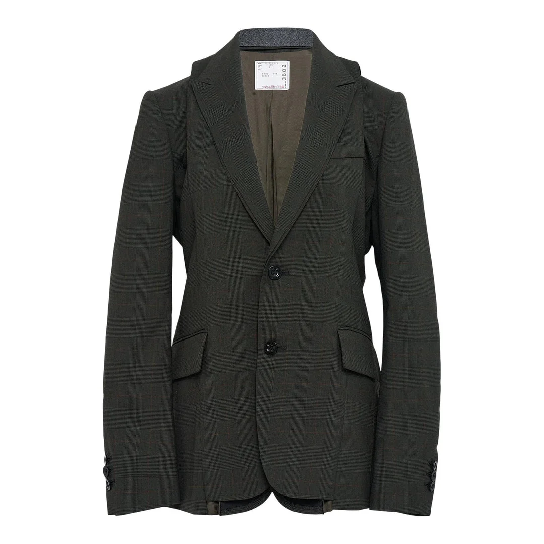 600070080KHA003 / 25-03802M/00/501 - Classic glen check wool blend construction - Two-button single-breasted closure - Notched lapel design - Contrast fabric hood attachment - Functional front pockets - Button cuff details - Deconstructed tailored fit - Signature sacai hybrid styling sacai Glen Check Jacket delivers avant-garde tailoring with hybrid construction and contemporary sophistication. Crafted from premium wool blend in classic glen check pattern, featuring the brand's signature deconstructed aesthetic with contrast fabric detailing. The innovative layered design and architectural silhouette create a statement piece that bridges formal and street sensibilities.