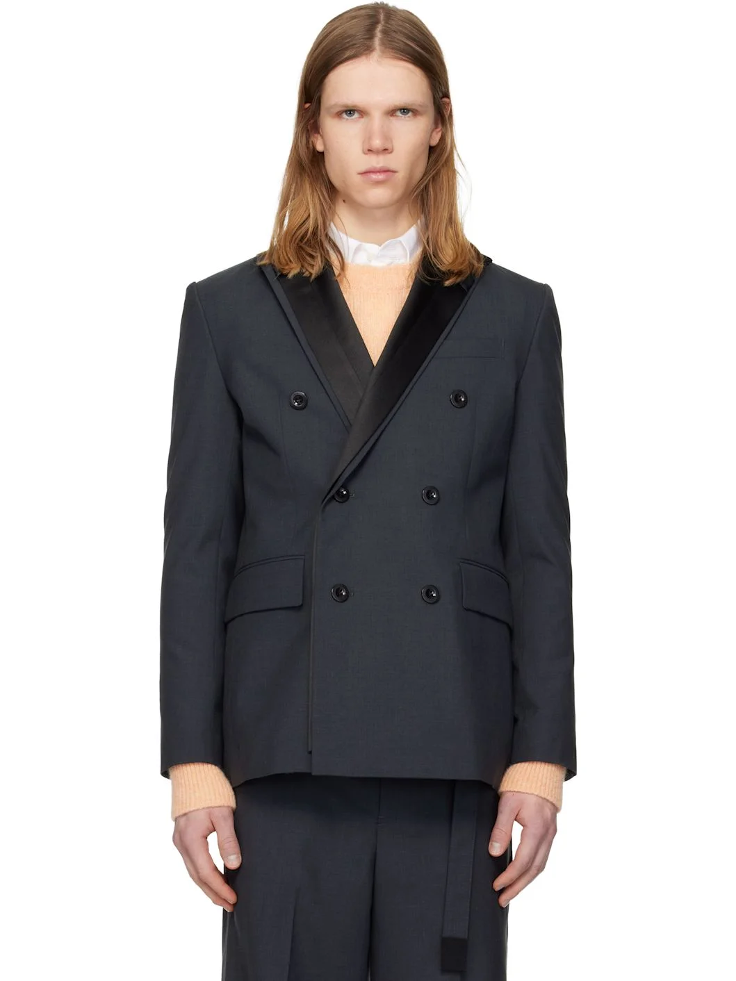Plain-woven wool-blend blazer. · Layered notched lapel · Double-breasted button closure · Welt pocket at chest · Flap pockets at front · Padded shoulders · Surgeon's cuffs · Central vent at back hem · Full satin lining Supplier color: Gray Body: 70% polyester, 30% wool. Trim: 100% polyester. Lining: 100% cupro. Made in Japan 261445M195004