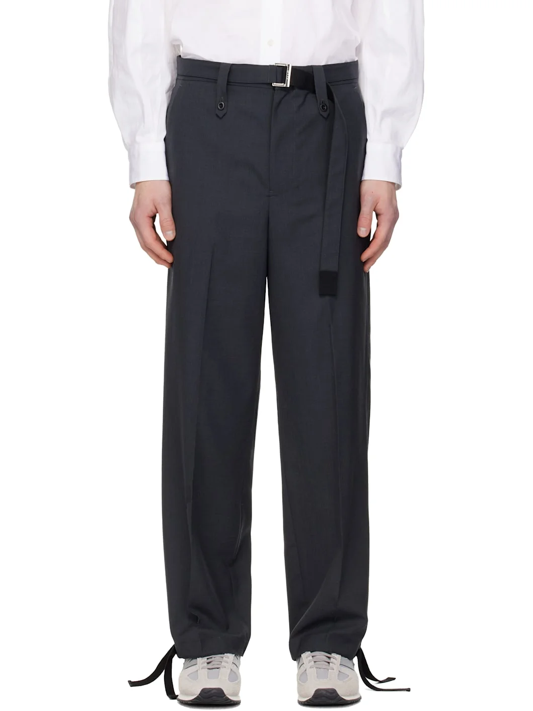 Wool-blend delaine trousers. · Belt loops and detachable cinch belt at waistband · Five-pocket styling · Zip fly · Drawstring at cuffs · Partial satin lining Supplier color: Gray Body: 65% polyester, 35% wool. Lining: 100% cupro. Made in Japan 261445M191022