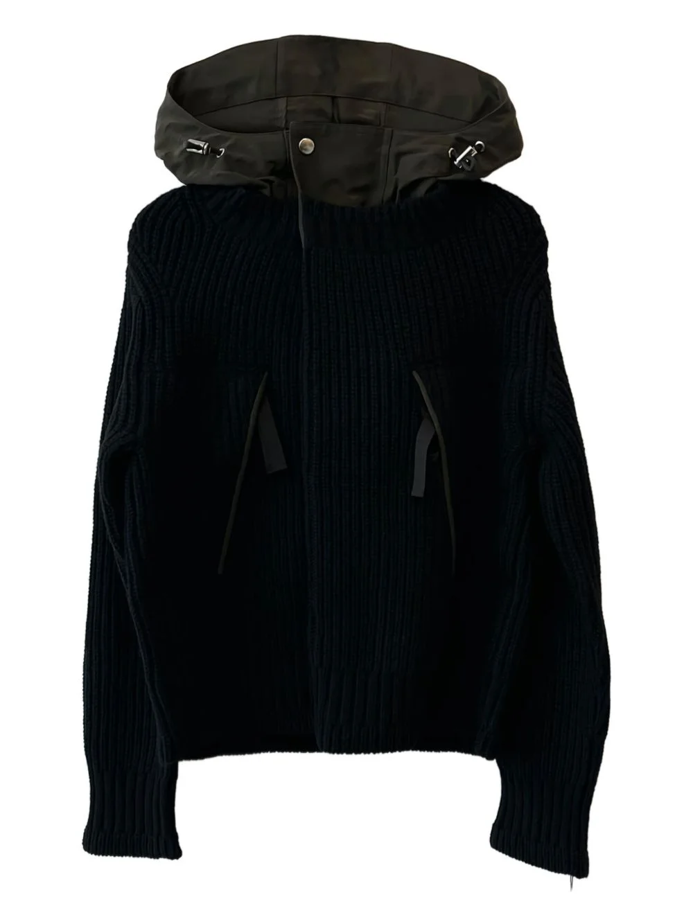 hooded ribbed knit jacket Highlights - Black - Ribbed knit - Detachable hood - Zip fastening - Welt pockets - Drawstring hem Imported Composition Fabric 100% Washing instructions Read Manufacturer Guidelines