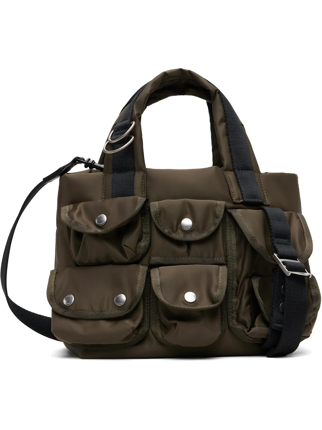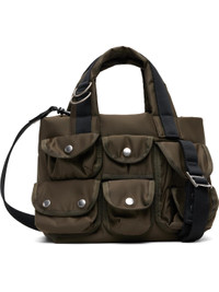Technical nylon satin tote. · Carry handles at top with D-rings · Adjustable and detachable crossbody strap · Flap pockets at face · Satin lining · H8.5" x W8" x D6.25" Supplier color: Dark khaki Nylon. Made in Japan 261445M172005