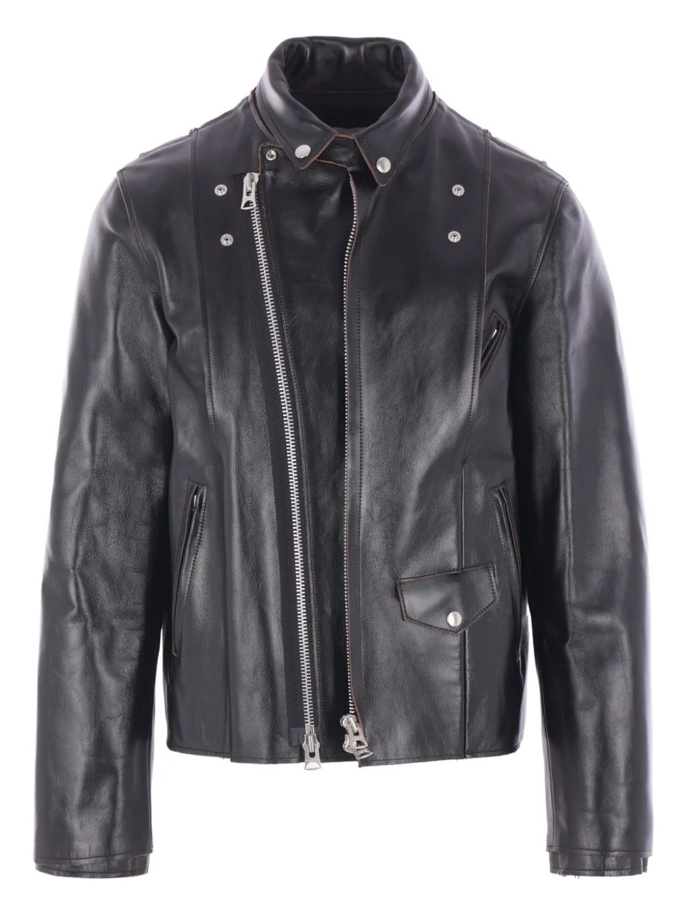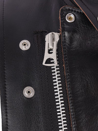 snap-fastening leather jacket Highlights - Black - Cowhide leather - Snap-fastening collar - Zip fastening - Brown contrast - Side zip pockets Imported Composition Calf Leather 100%