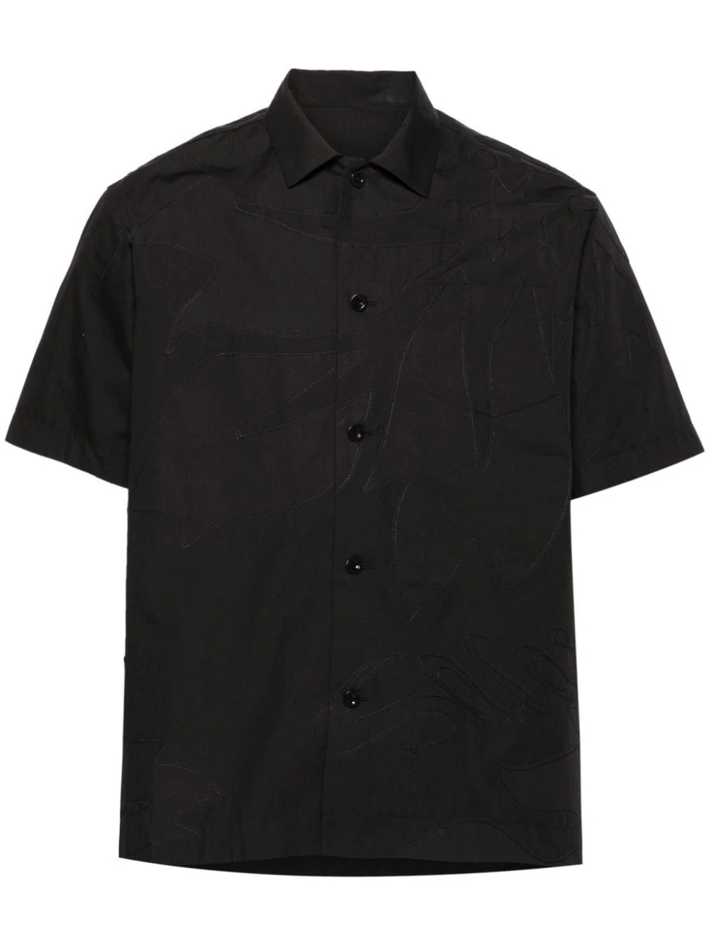 motif-embroidered poplin shirt Highlights - Black - Poplin texture - All-over motif embroidery - Classic collar - Logo-engraved buttons - Front button fastening - Short sleeves - Chest patch pocket - Short side slits - Step hem Imported Composition Polyester 65%, Cotton 35% SIZE & FIT Model measurements Height 6 ft 2 in(1.87 m) Bust/Chest 36.22 in(92 cm) Hips 37 in(94 cm) Waist 27.95 in(71 cm) FittingInformation Designed for a boxy fit, intended for a loose fit throughout Made from a midweight non-stretch fabric This piece fits true to size – take your usual size