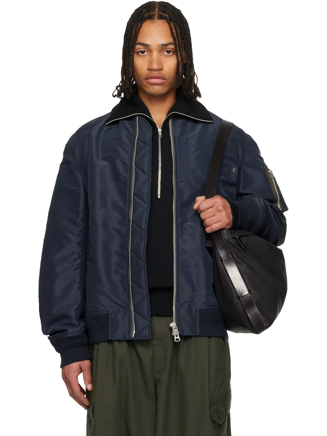 Nylon twill bomber jacket. · Rib-knit stand collar, hem, and cuffs · Two-way zip closure · Press-stud tabs at chest · Welt pockets at front · Press-stud vent at side seams · Utility pocket at sleeve · Welt pockets at interior · Full satin lining Supplier color: Navy Body: 100% nylon. Trim: 55% polyester, 44% cotton, 1% polyurethane. Trim 2: 100% polyester. Lining: 100% polyester. Made in Japan 261445M175003