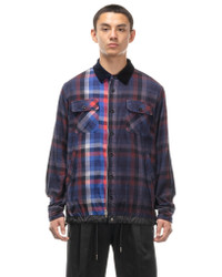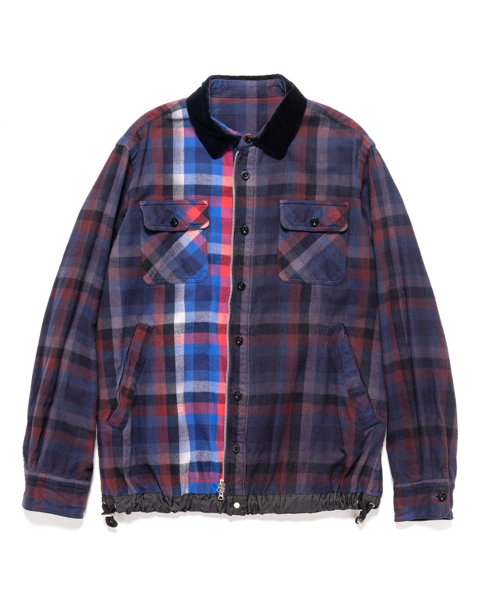 A multi colour plaid button down shirt with button cuffs. Contrast collar, buttoned chest pockets with slant hand pockets on each side. Contrast cinched hem with toggles, contrast collar and dual button/ zip front. Made in Japan. DETAILS - 22-02838M - 100% Cotton - Side hand pockets - Button chest pockets - Contrast collar - Button & zip fastening front - Contrast hem cinch - Made in Japan