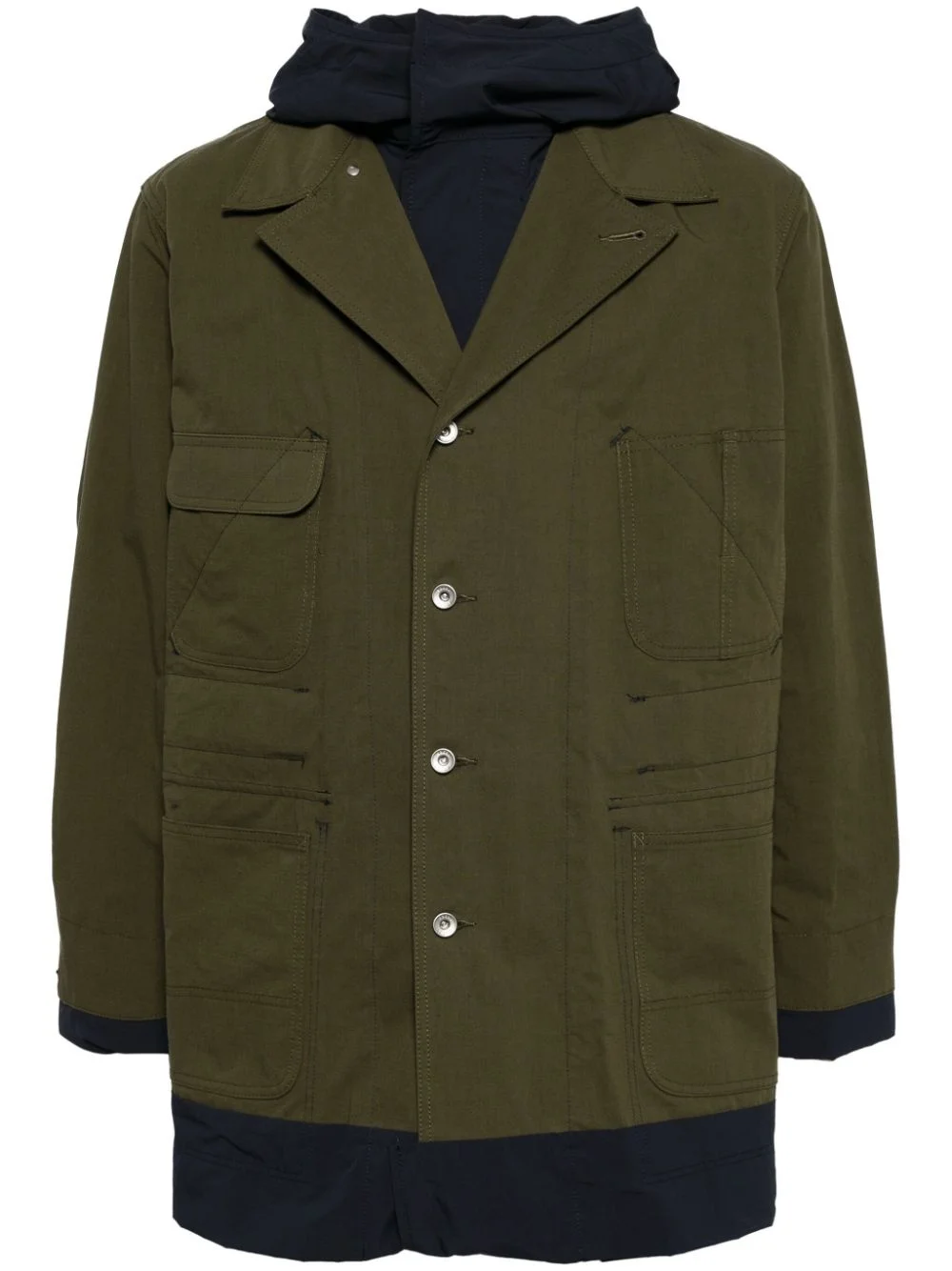 single-breasted coat Highlights - Khaki/navy blue - Cotton blend - Layered design - Drawstring hood - Notched collar - Front button fastening - Long sleeves - Chest patch pocket Imported Composition Lining: Polyester 100% Outer: Cotton 50%, Nylon 50% SIZE & FIT Model measurements Height 6 ft 2 in(1.87 m) Bust/Chest 34.25 in(87 cm) Hips 36.22 in(92 cm) Waist 29.52 in(75 cm) FittingInformation Designed to be unstructured, offering a loose fit throughout Made from a midweight non-stretch fabric This piece fits true to size – take your usual size