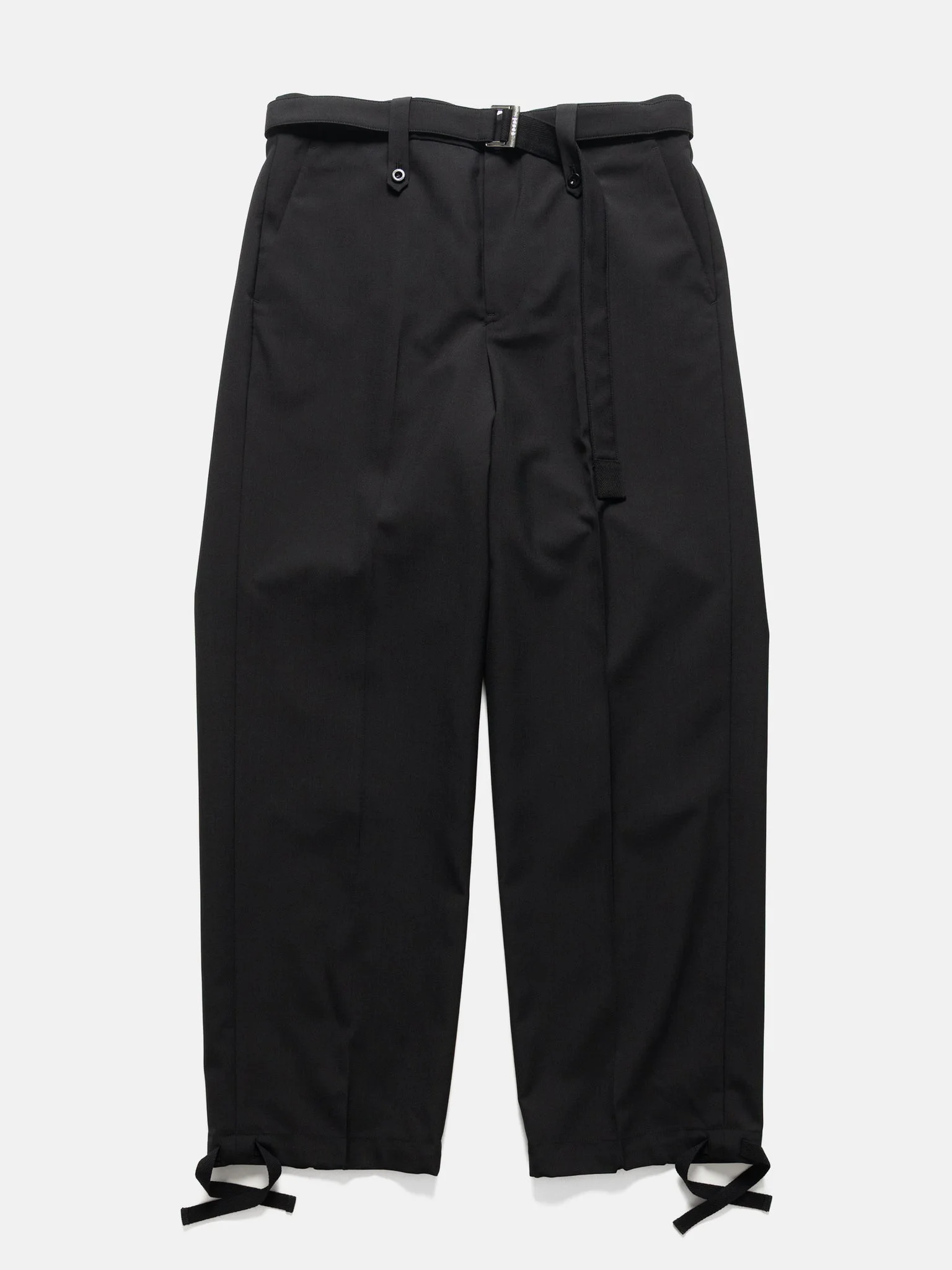 The sacai Suiting Pants offer a relaxed take on classic tailoring, cut from a refined polyester-wool suiting fabric with a clean, straight silhouette. Subtle structural details and an integrated belt give the design quiet definition, while an easy drape keeps the feel modern and effortless. Made in Japan, they reflect sacai’s balance of precision and everyday wearability. DETAILS - 26-03902M - Body: 70% Polyester, 30% Wool - Liner: 100% Cupro - Relaxed, straight fit - High waisted - Integrated waist belt - Flat front pleat - Zip fly with button closure - Slanted hand pockets - Flapped back pockets - Drawstring at cuffs - Made in Japan