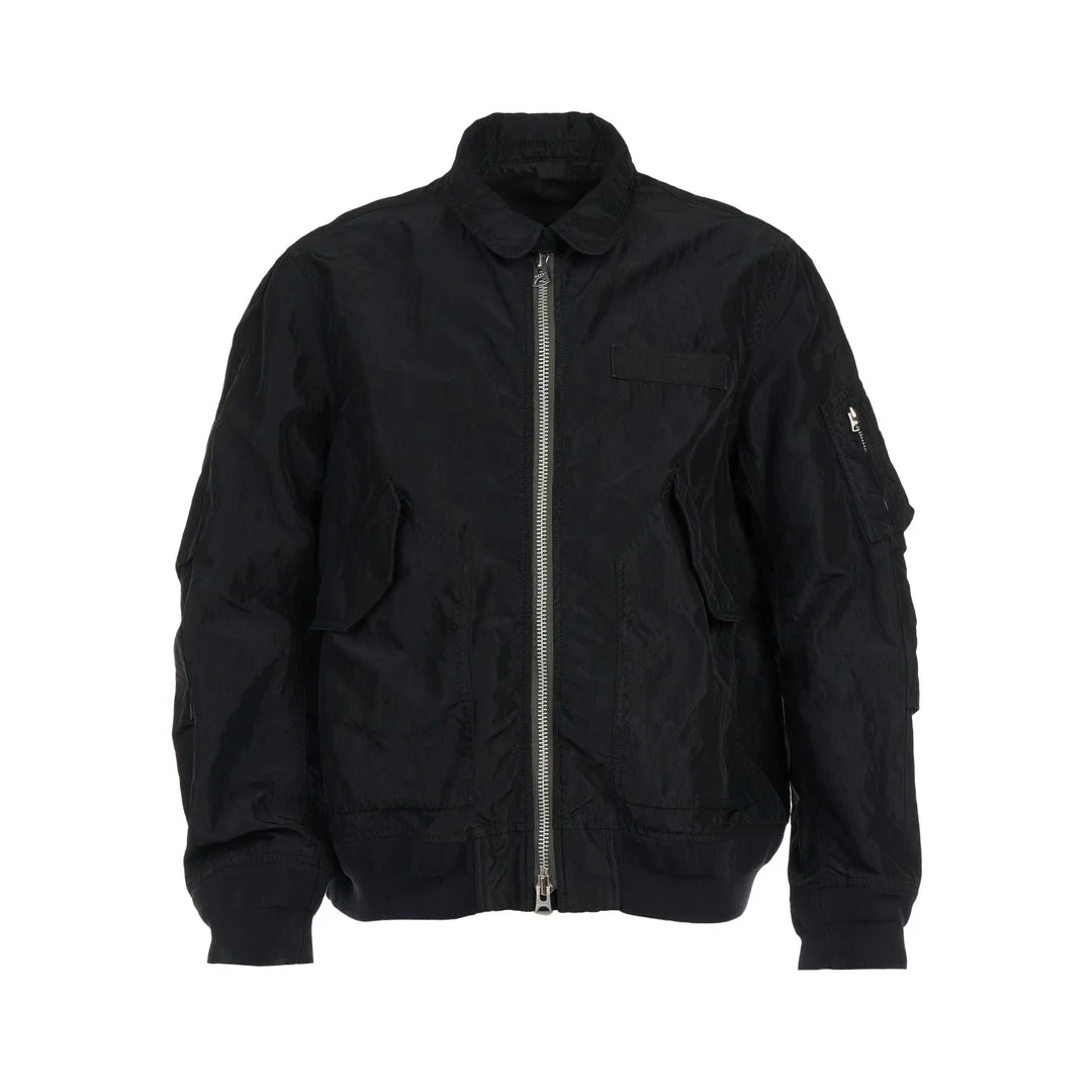 300050800BLK-01 / S626-03913M/00/001 - Treated nylon twill construction - Front zip closure with premium metal hardware - Ribbed collar, cuffs, and hem - Chest patch pocket - Utility pocket on left sleeve - Relaxed bomber silhouette - Fully lined interior The sacai Treated Nylon Twill Blouson delivers contemporary Japanese luxury with innovative fabric treatment and architectural silhouette. Crafted from specially treated nylon twill in classic black, featuring signature bomber styling with premium metal zipper closure. The structured construction and sacai's signature deconstructed aesthetic create a versatile layering piece for modern urban wardrobes.