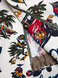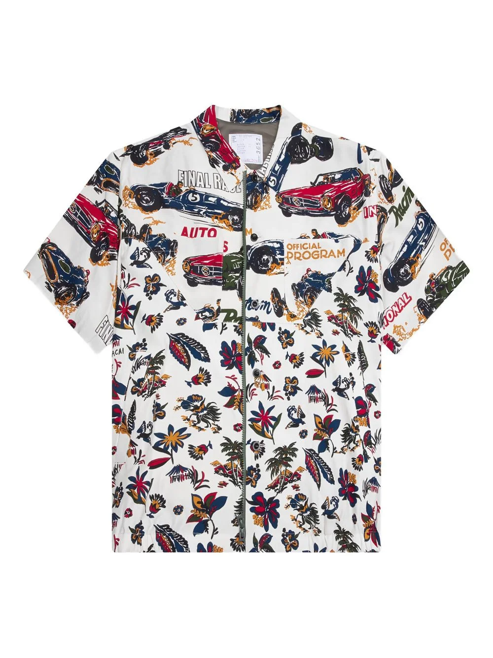 race-car tropical-print shirt Highlights - White - Car-race print - Tropical print - Zip fastening - Short sleeves Made in United States Composition Rayon 55%, Cotton 45% Washing instructions Dry Clean Only