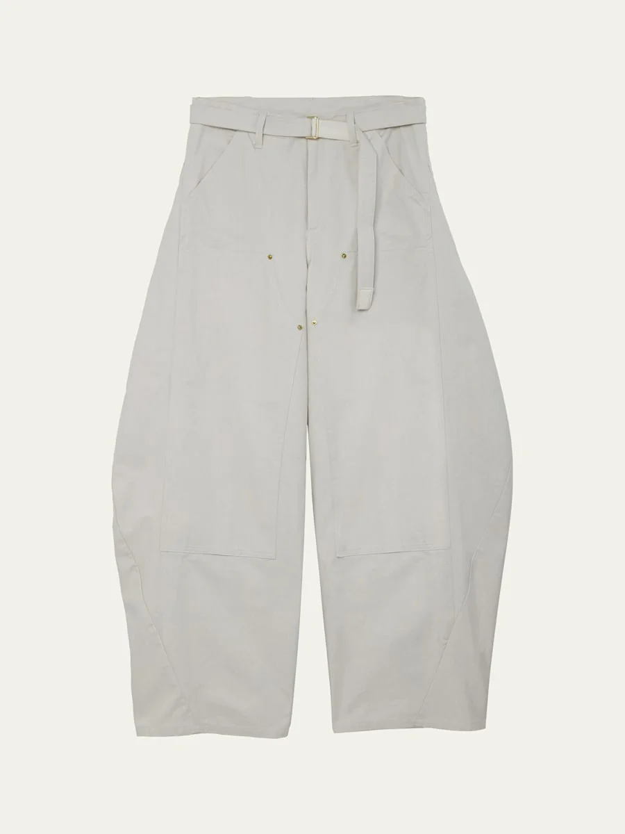 The SACAI x Carhartt "WIP" Duck Pants combine the voluminous, pleated silhouette of sacai's trousers with elements of Carhartt WIP's DoubleKnee Pant. Made from Carhartt WIP's signature Dearborn Canvas Regular rise Flat front Fivepocket style Cobranded woven label Doublelayer knees Carpenter pockets Painter's loop referencing Carhartt WIP's DoubleKnee Pant Relaxed fit through barrel legs Adjustable cinch selfbelt; belt loops Tonal stitching Cotton Dry clean Made in Japan