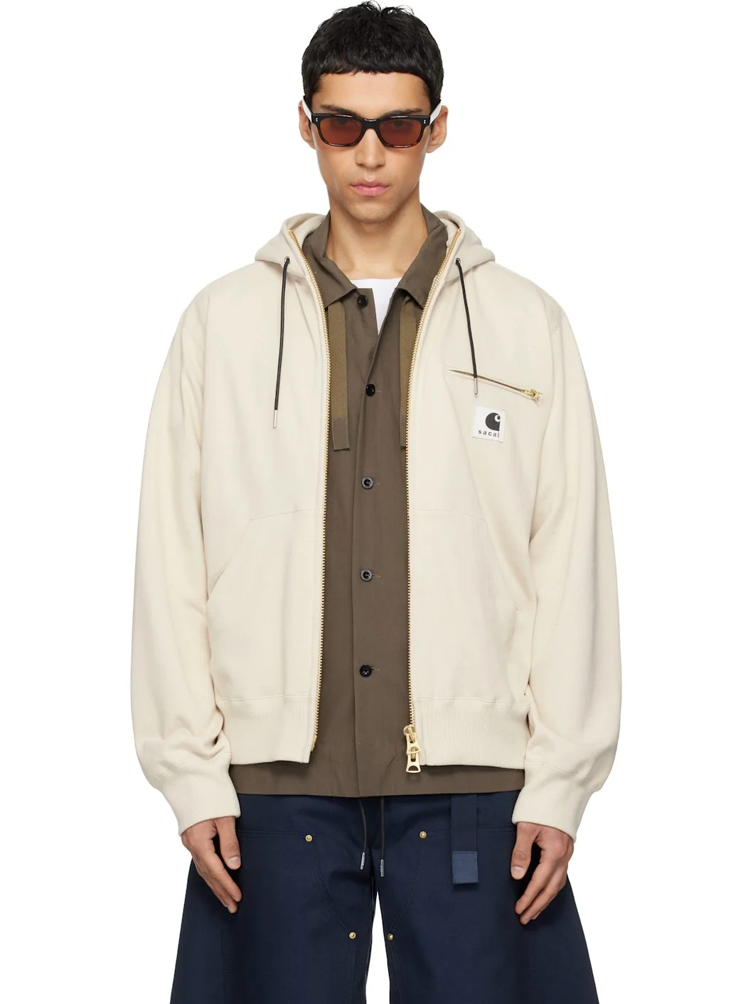 French terry hoodie. · Drawstring at hood · Two-way zip closure · Zip pocket and logo patch at chest · Welt and patch pockets at front · Rib-knit hem and cuffs Part of the sacai x Carhartt Work In Progress collaboration. Supplier color: Ivory Body: 100% cotton. Trim: 95% cotton, 5% polyurethane. Made in Japan 261445M202025