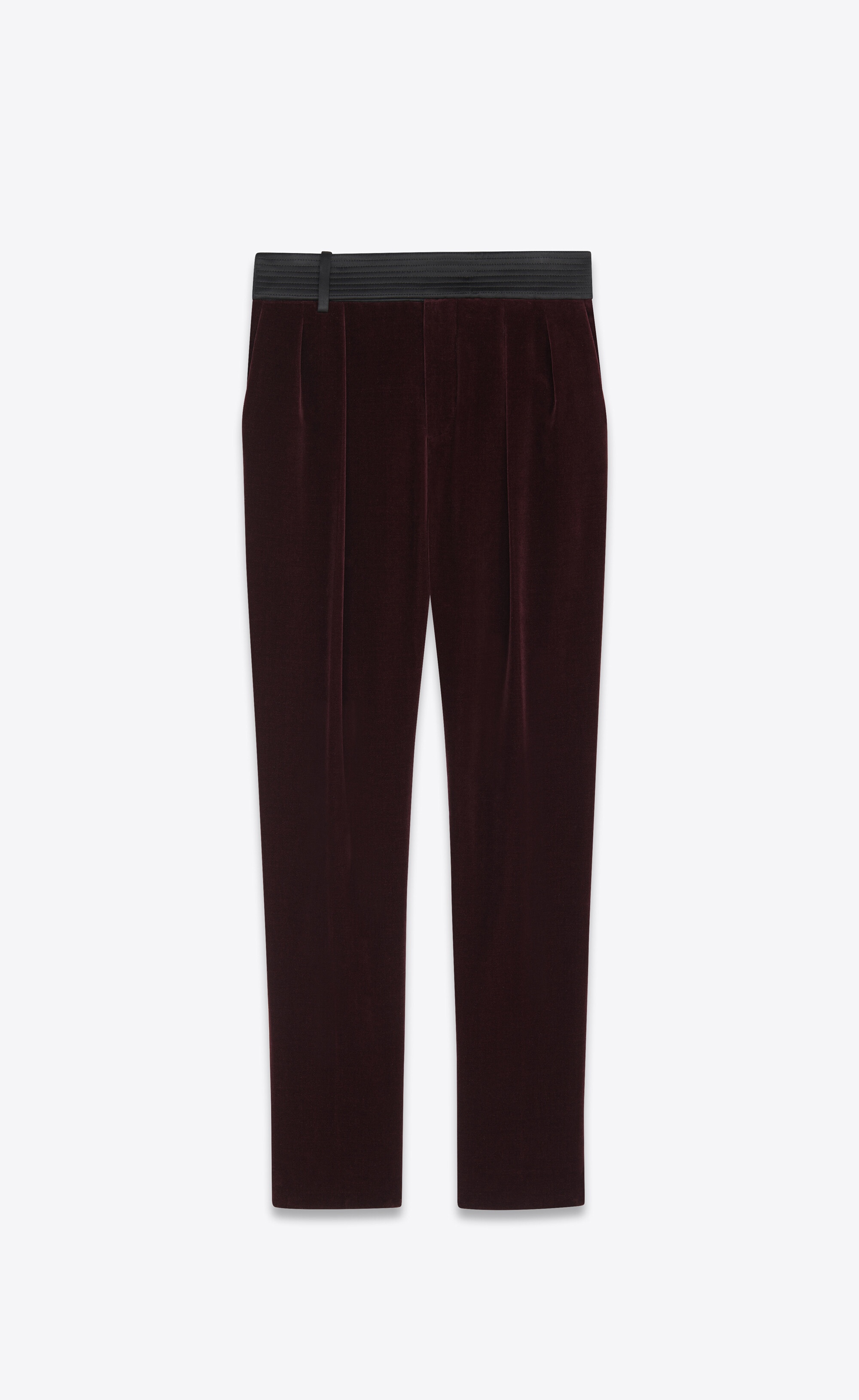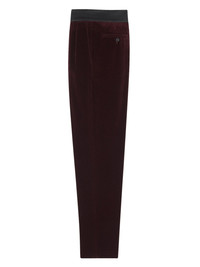 velvet-effect slim-cut trousers Highlights - Burgundy - Cotton - Slim cut - Velvet - Pleat detailing - Concealed front fastening - Two side slit pockets - Two button-fastening pockets - This item is made from at least 50% organic materials. - Learn more about what makes a product conscious on our conscious criteria page Made in Italy Composition Outer: Cotton 100%