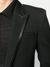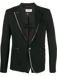 contrast trim blazer High-shine details add an opulent feel to this Saint Laurent blazer. In a fitted, formal style, this is a piece to make an impression in. Button up. Featuring a collar style, front welt pockets, long sleeves, a front button fastening and long sleeves. Imported Composition Lining: Silk 100% Outer: Wool 100%, Polyester 60%, Spandex/Elastane 40% SIZE & FIT Model measurements Height 6 ft 1 in(1.85 m) Bust/Chest 35.82 in(91 cm) Hips 37.79 in(96 cm) Waist 29.13 in(74 cm) Washing instructions Dry Clean Only