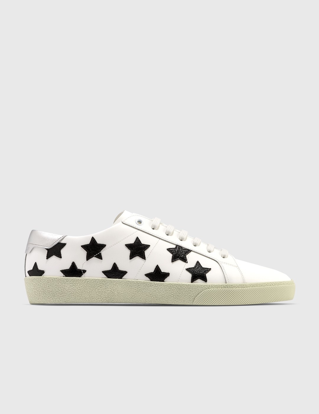 - Saint Laurent - Court Classic SL/06 Metallic California Sneaker - Low top sneaker - Leather upper - Metallic leather stars - Saint Laurent signature embossed back tab - Lace closure - Rubber outsole - Color: White/Black/Silver - Material: 100% Calfskin Leather