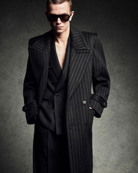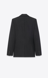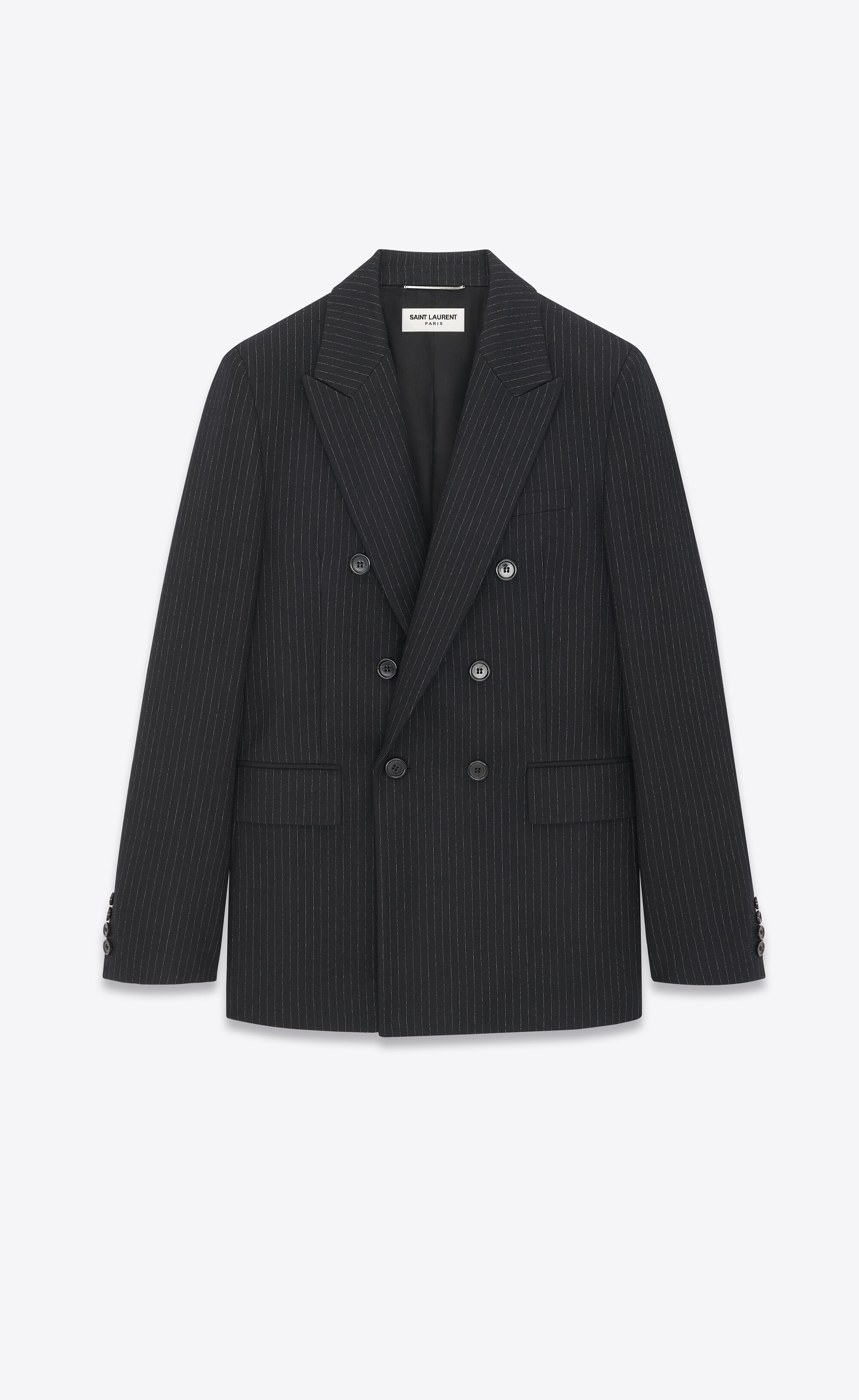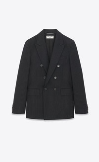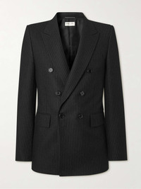 The foundation of SAINT LAURENT's tailoring lies in its impeccable craftsmanship and attention to detail. This double-breasted jacket is cut from wool and cotton-blend flannel with monochrome pinstripes - the pattern only adds to the '70s look of the peak lapels and structured shoulders. Size & Fit - Fits true to size. Take your normal size - Tailored for a slightly loose fit - Internal shoulder pads - Mid-weight, non-stretchy fabric - Model is shown wearing an IT 44 - Model measures: chest 34"/ 86cm, height 6'2"/ 187cm Details & Care - Charcoal and white wool and cotton-blend flannel - Peak lapels, non-functioning buttoned cuffs, chest welt pocket, two front flap pockets, single vent, two internal pockets, fully lined - 98% wool, 2% cotton; lining: 100% silk; pocket lining: 97% cotton, 3% elastane - Button fastenings - Dry clean