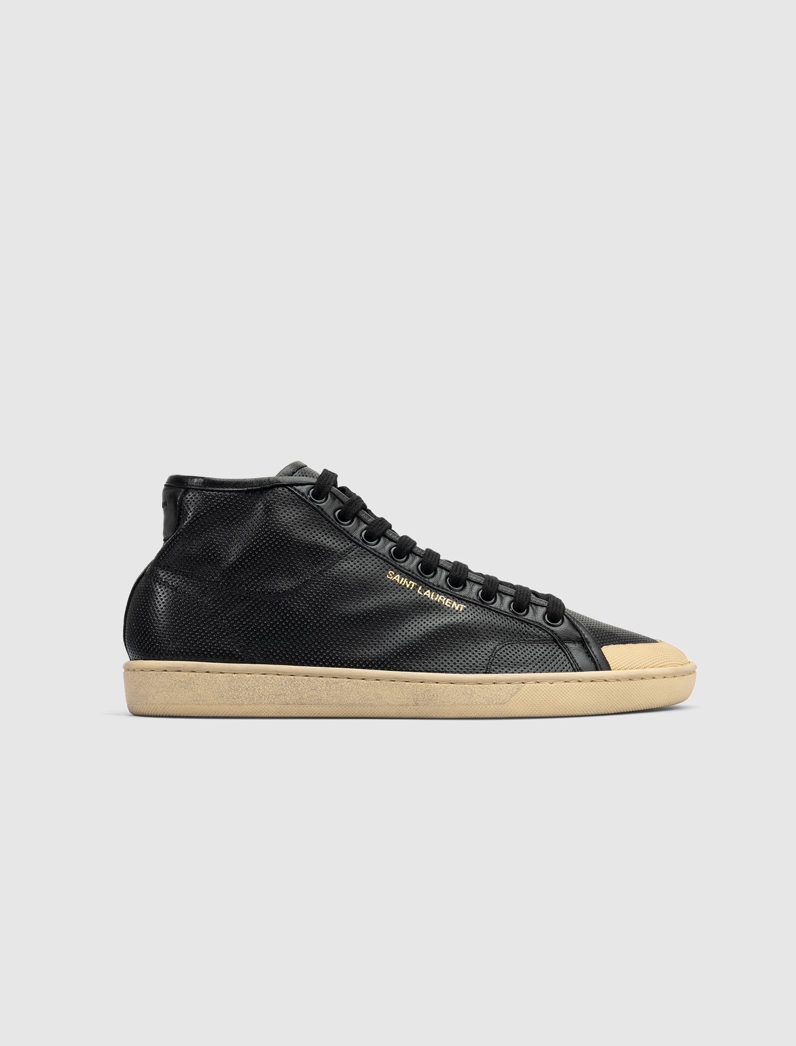 High top sneakers. Perforated leather upper. Front lacing. Leather tongue. Gold-stamped logo below the outer eyelet panel. Rubber toe cap. Rubber midsole. Rubber outsole. Worn-in effect on the midsole, and outsole. - Leather upper SKU: 713564AACLS-1000