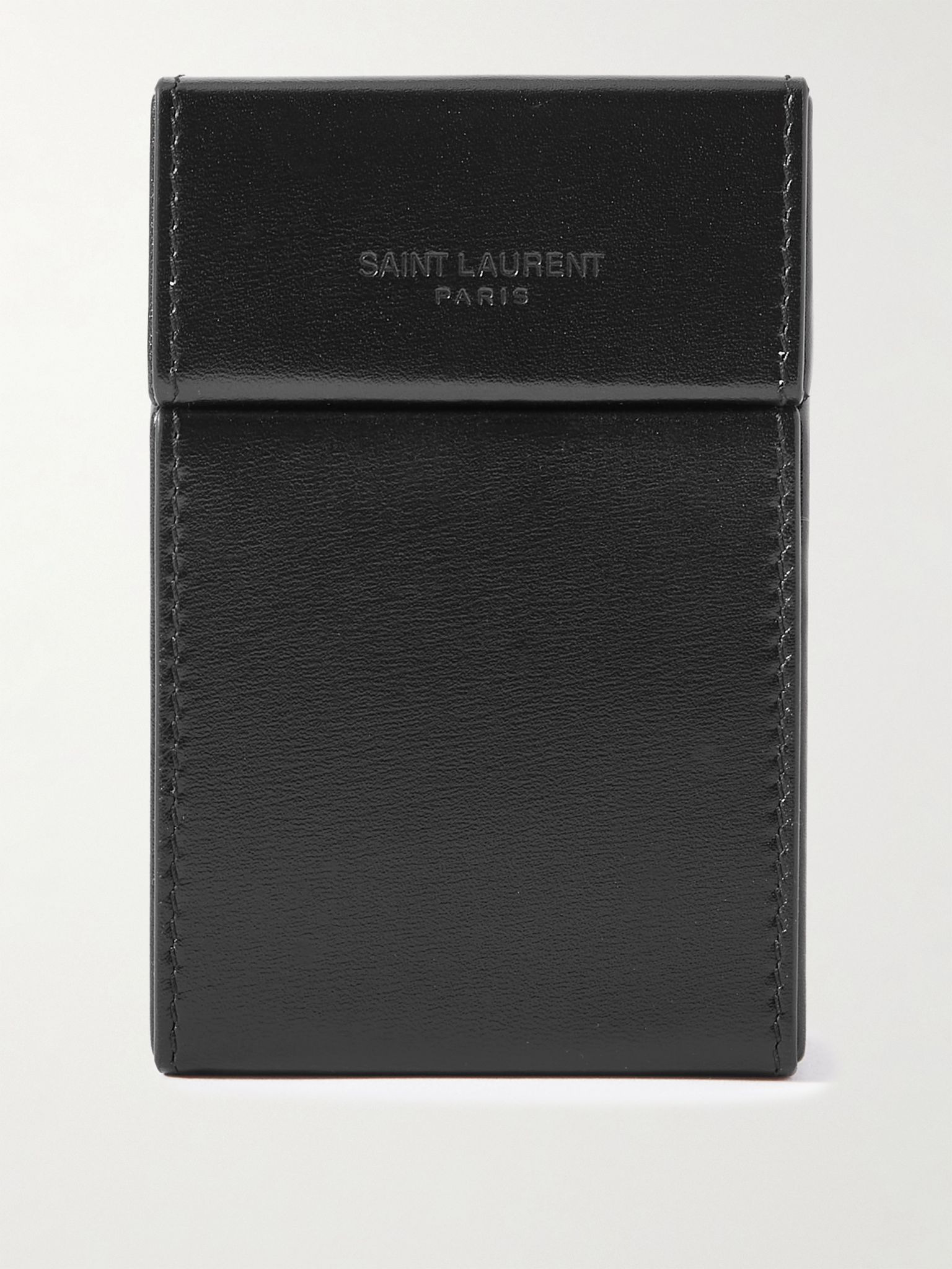 Designed in the shape of a cigarette box, SAINT LAURENT's pouch is destined to be a collector's item. It's crafted from smooth leather, embossed with the label's moniker and home city and fully lined, so it doubles as a safe place to store loose jewellery or cufflinks when travelling. Details & Care - Black leather (Calf) - Debossed designer emblem - Fully lined - Comes with dust bag