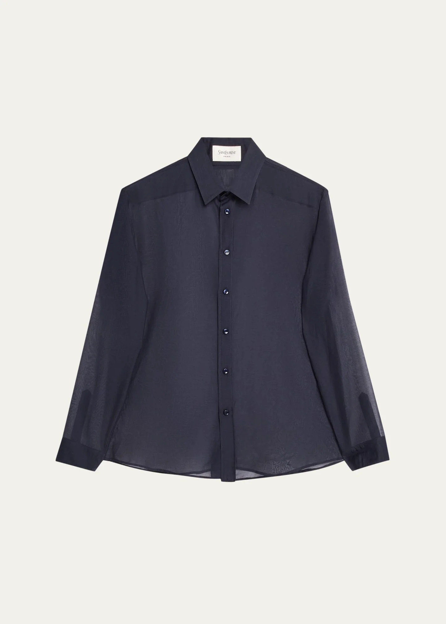 Saint Laurent semi-sheer sport shirt showcasing a pointed collar and straight shoulders Button placket Long sleeves Mitered barrel cuffs Shirttail hem Relaxed fit Cotton/silk Made in Italy Online Inquiries: BGS21_NCUV5| Store Inquiries: #4956110