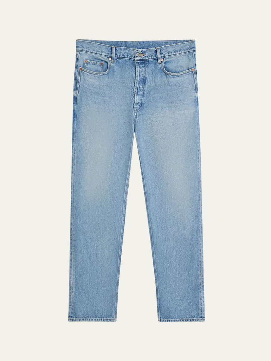 Saint Laurent jeans in faded denim Regular rise Five-pocket style Back suede logo patch Straight legs Button-fly; belt loops Cotton/suede Imported Online Inquiries: BGS21_NCR2L| Store Inquiries: #4932946