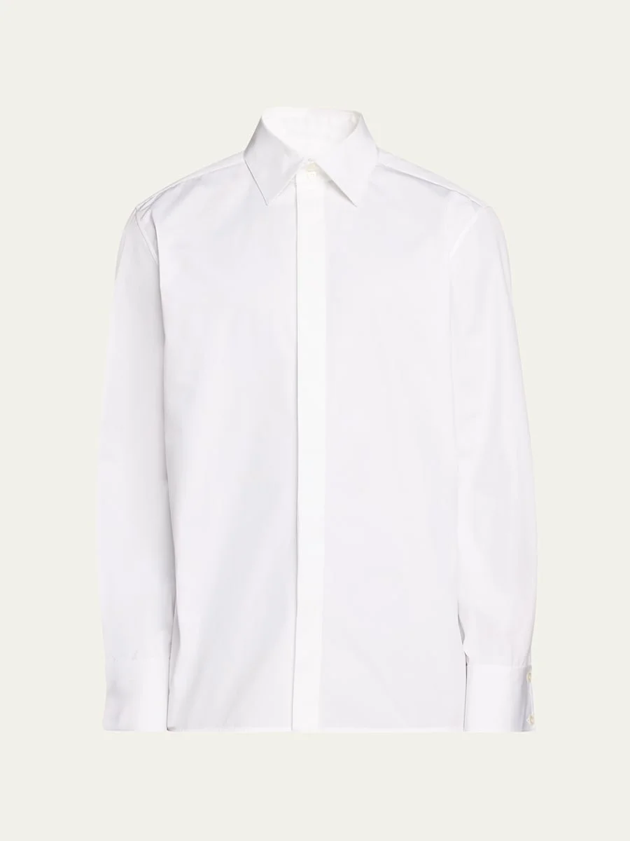 Saint Laurent dress shirt in solid poplin Point collar Concealed button placket Long sleeves French cuffs Cotton Made in Italy Model is 6'1"/185cm. Online Inquiries: BGS21_NCDHY| Store Inquiries: #4862381