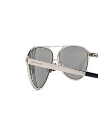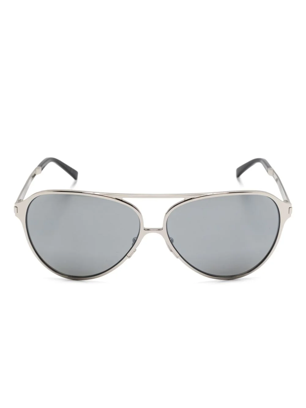 pilot-frame sunglasses Highlights - Silver-tone - Pilot frame - Grey tinted lenses - Double bridge - Straight arms - Logo-engraved arm - Curved tips - Nose pads - These glasses come with a protective case. Imported Composition Metal 80%, Acetate 20% SIZE & FIT Measurement Arm Length 5.51 in(14 cm) Bridge Width 0.47 in(1.2 cm) Lens Diameter 2.44 in(6.2 cm) Total Width 5.7 in(14.5 cm)