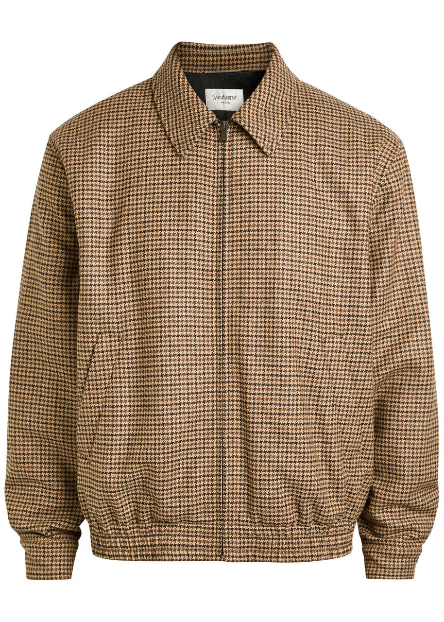 Info & Care Saint Laurent woven jacket Houndstooth jacquard, adjustable button-fastening cuffs, side slip pockets, elasticated hem, internal slip pocket, fully lined Zip fastening through front 34% wool, 31% acrylic, 24% polyester, 7% polyamide, 2% other fibres, 2% silk; lining: 64% viscose, 36% cotton Dry clean Size & Fit Length shoulder to hem: 26 inches/ 66cm Midweight Relaxed fit, boxy style Model is 6'1"/ 185cm, chest size 38.5 inches and wears a size;IT48