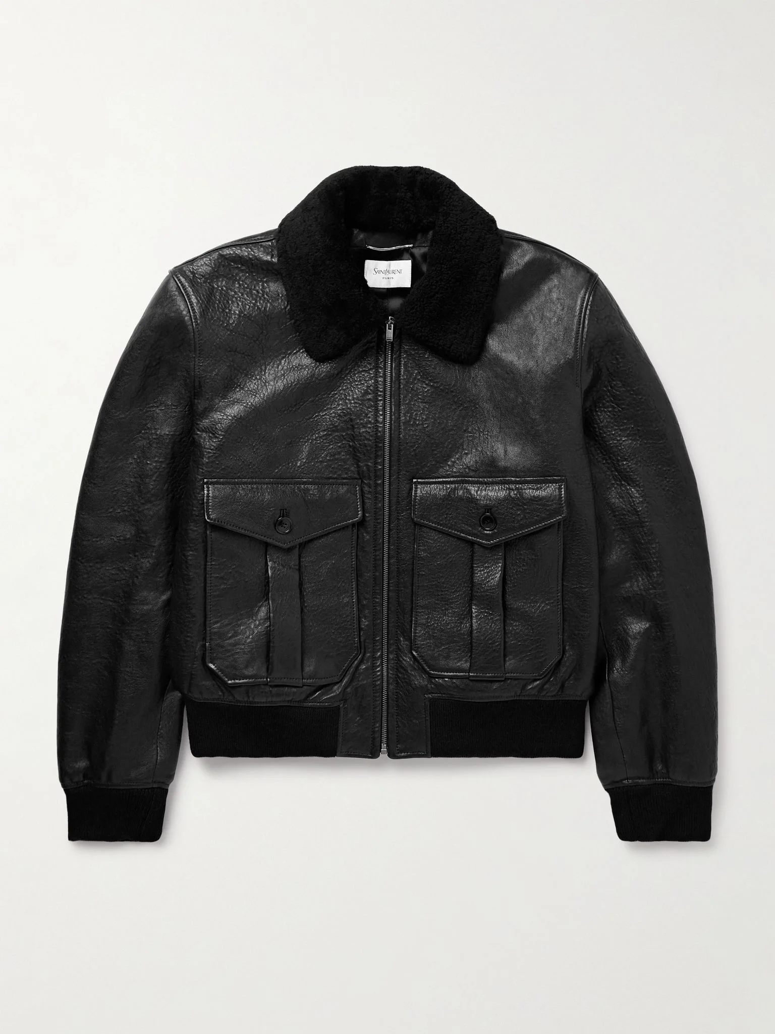 Few designers do outerwear quite like SAINT LAURENT. An investment that we can almost guarantee will pay off, this jacket has been made in Italy from full-grain leather and has a plush shearling collar. Wear it with practically any outfit and look infinitely cooler. Size & Fit - Fits true to size. Take your normal size - Designed for a regular fit - Ribbed hem - Supple, non-stretchy leather - Model is shown wearing an IT 48 - Model measures: chest 38"/ 96cm, height 6'2"/ 188cm Details & Care - Black leather and shearling - Zip fastening - 100% leather (Lamb); trim: 100% shearling (Lamb); buttons: 100% horn (Buffalo); lining1: 56% cotton, 44% viscose; lining2: 100% cotton - Fully lined - Specialist clean