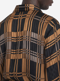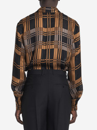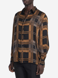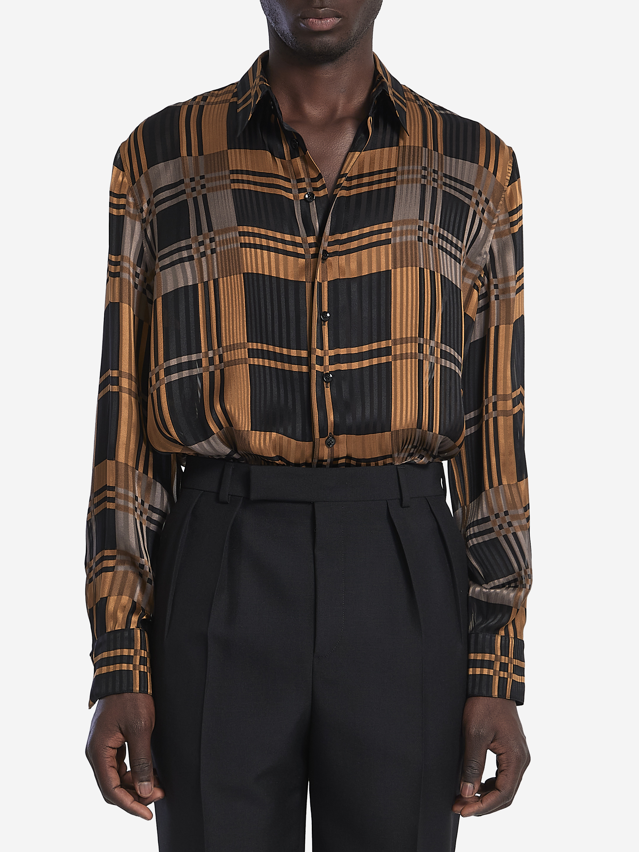 Lightweight semi-transparent silk shirt with a black, gold, and silver checkered print and a satin finish. It features a pointed collar, button closure, and buttoned cuffs. The model is 187cm tall and wears a size IT 41. More Info Product Number : 3596365 Product Code : 813932Y1L281049 The model is 187cm tall and wears a size IT 41. Composition : 100% silk Made in: Italy