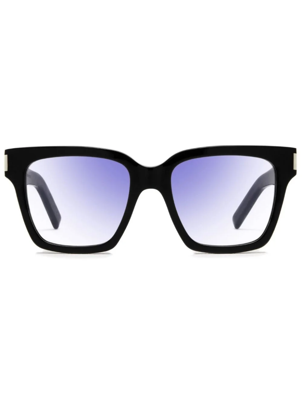square-frame tinted-lens sunglasses black acetate square frame tinted lenses UV-protective lenses sculpted arms curved tips These glasses come with a protective case. Made in United States Composition Acetate 100% SIZE & FIT Measurement Arm Length 57.08 in(145 cm) Bridge Width 7.48 in(19 cm) Lens Diameter 21.25 in(54 cm)
