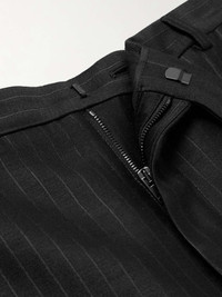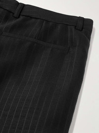 Under the helm of Anthony Vaccarello, SAINT LAURENT's forte for sharp tailoring is in safe hands. Worn with multiple looks on the SS24 runway, these suit trousers are made from pinstriped wool and silk-blend that has a subtle sheen as the light hits. They're tailored in a straight shape with sharply pressed creases and have unfinished hems, so you can have them altered to your preferred break. Size & Fit - Fits true to size. Take your normal size - Regular-straight leg, mid-rise trousers - Unfinished hems; alter to fit - Mid-weight, non-stretchy fabric - Model is shown wearing an IT 48 - Model measures: waist size 32, height 6'0"/ 183cm Details & Care - Black wool and silk-blend - Belt loops, two front slash pockets, two back welt pockets, front and back pleats, unfinished hems - Hook, button and zip fastening - 69% wool, 31% silk; lining: 97% cotton, 3% elastane - Dry clean