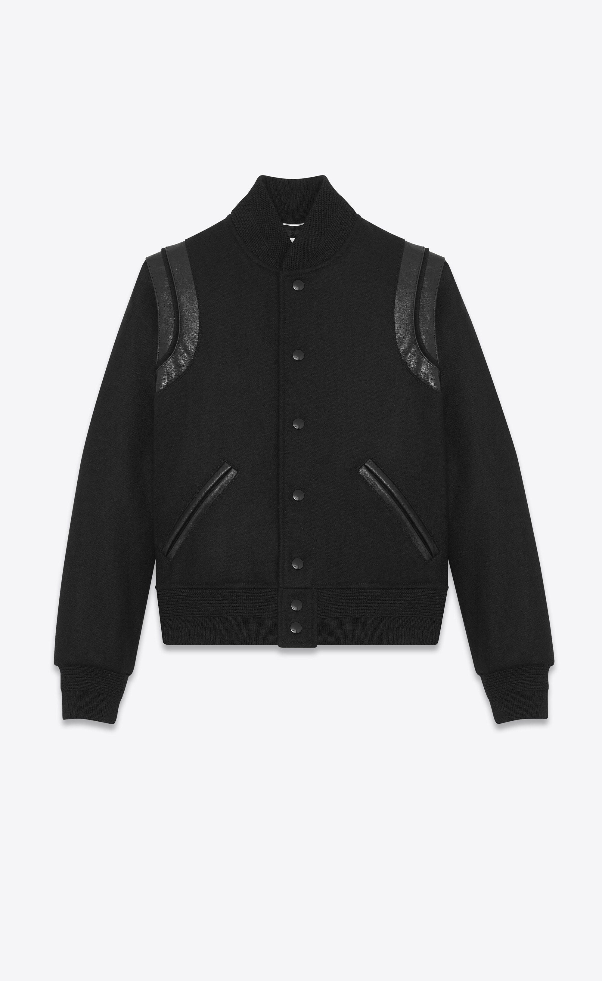 CLASSIC SAINT LAURENT TEDDY JACKET MADE WITH RESPONSIBLE WOOL WITH LEATHER TRIM AROUND SHOULDERS AND RIBBED COLLAR, CUFF AND WAISTBAND. - 100% WOOL, LAMBSKIN - RESPONSIBLE WOOL - CUPRO AND COTTON LINING - FRONT SNAP-BUTTON CLOSURE - TWO JETTED POCKETS AT THE FRONT - TWO INNER POCKETS - RIBBED COLLAR, CUFFS AND WAISTBAND - STYLE ID 354718Y197Q1000 - MADE IN ITALY