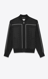 TEDDY JACKET WITH RIB-KNIT COLLAR, CUFFS AND HEM, DECORATED WITH ALL-OVER YSL INITIALS DOT PATTERN WITH WHITE DETAILING. - 100% SILK - SILK LINING - ZIP FRONT CLOSURE - TWO SLIT POCKETS AT THE FRONT - TWO INNER POCKETS - RIBBED COLLAR - RIBBED CUFFS - RIBBED WAISTBAND - STYLE ID 663529Y2D711095 - MADE IN ITALY