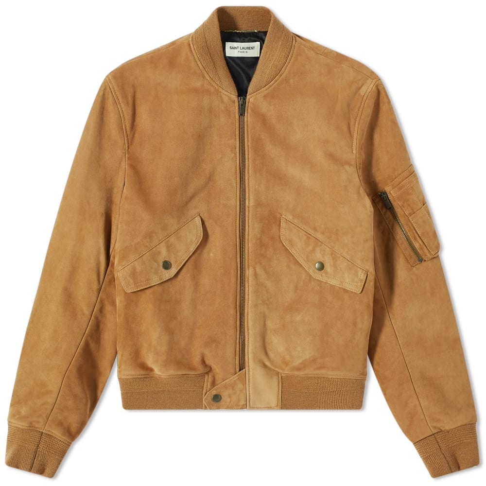 When you look at this bomber jacket, you see why Saint Laurent is so deserving of its luxurious reputation. It’s crafted in Italy from buttery soft lambskin suede, wrapping you in tobacco hues that transition seamlessly from season to season. The style’s military influences are retained, though, in the utility pocket and ribbed trims. - 100% Lambskin Suede - Zip Closure - 2 Side Pockets - Utility Pocket - Ribbed Trims - Made in Italy