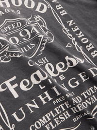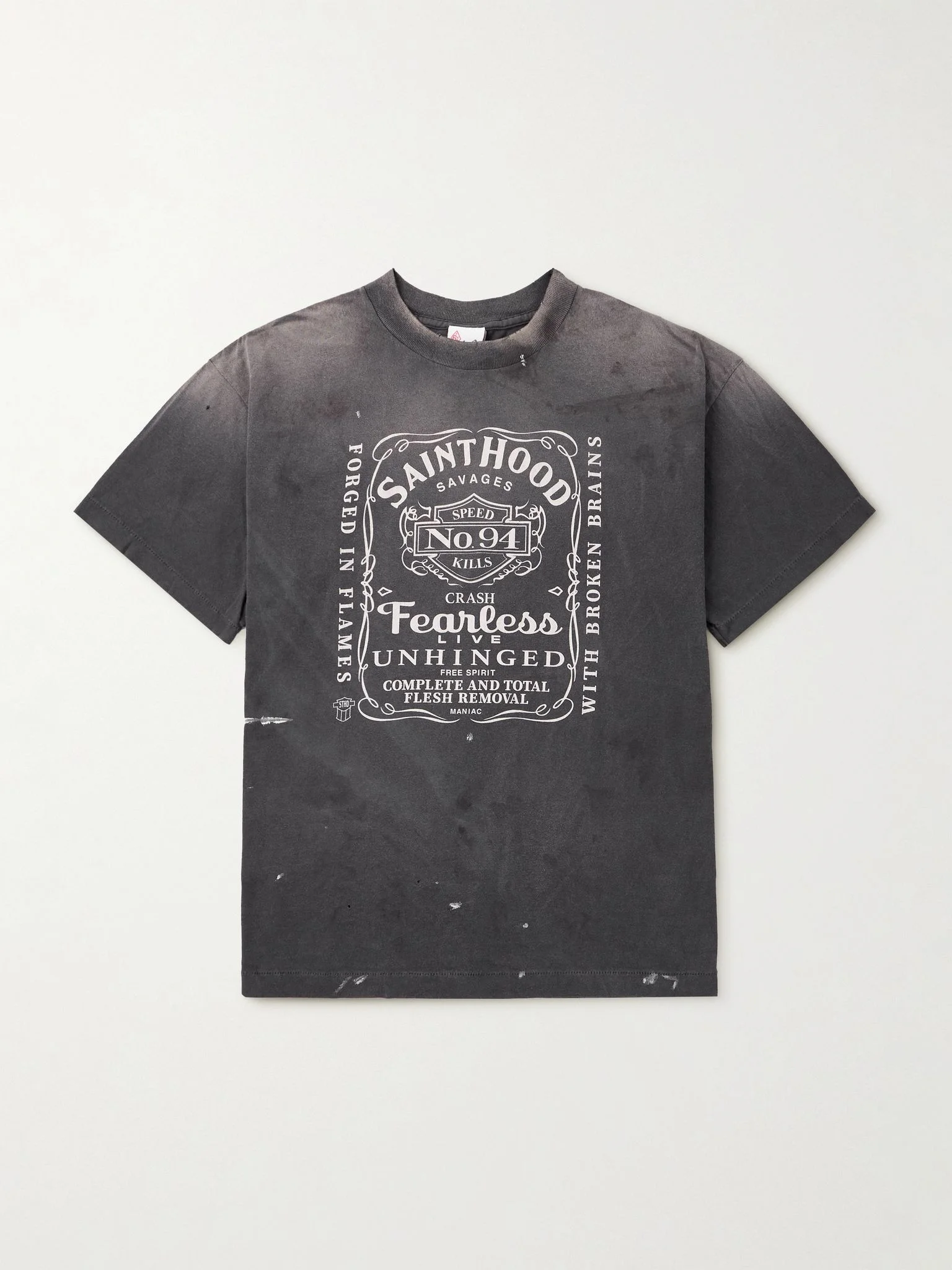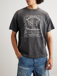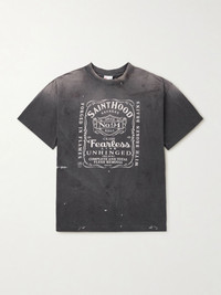 True to both SAINT Mxxxxxx and Neighborhood's subversive spirit, the printed graphic on the front of this T-shirt is reminiscent of the logo of a renowned whiskey brand. It's been cut in Japan from comfortable cotton-jersey and artfully hand-distressed. Size & Fit - Fits true to size. Take your normal size - Designed for a relaxed fit - Mid-weight, slightly stretchy fabric - Model is shown wearing a M - Model measures: chest 38"/ 96cm, height 6'2"/ 188cm Details & Care - Charcoal and white cotton-jersey - 100% cotton - Machine wash
